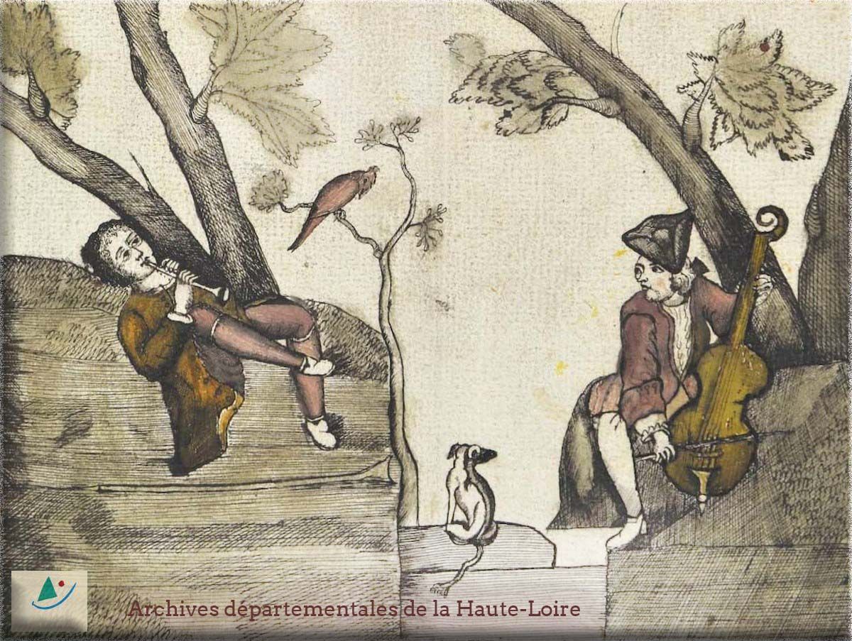 Illustration : dessin de frontispice par J. P. Deluc, flûtiste et joueur de viole accompagnés d’un oiseau et d'un chien, plume et gouache (extrait), tiré du compoix du Puy-en-Velay par Mondilhon et Moliérer, notaires, experts et féodistes dans le diocèse du Puy, 1720-1730 (149 J 626).