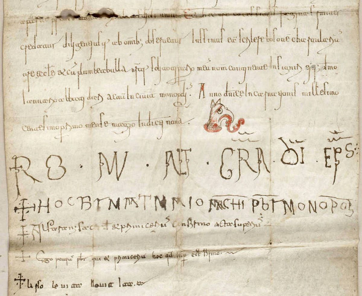 - Cette charte datant de 1101, mise en ligne depuis un moment déjà puisque faisant partie des pièces sélectionnées lors de la numérisation partielle du fonds de l'Abbaye de La Chaise-Dieu (cotée 1 H 171/1-2), mérite d'être (re)découverte. Sur le fond elle constitue un acte de don de deux églises, par l'évêque de Monopoli (Italie) au monastère de Sainte-Marie de Monte Piloso (Italie), qui dépend alors de l'Abbaye de La Chaise-Dieu. Sur la forme, ce parchemin est l'un des très rares disposant d'une illustration. Outre un superbe volatile chimérique à deux paires d'ailes, héraut transmettant le message, présent dans la marge de gauche, on remarque plus bas, à la fin du texte, une tête d'animal (issue du bestiaire fantastique ou représentant simplement un autre oiseau ?) qui semble soit cracher une flamme, soit tendre une langue extravagante.