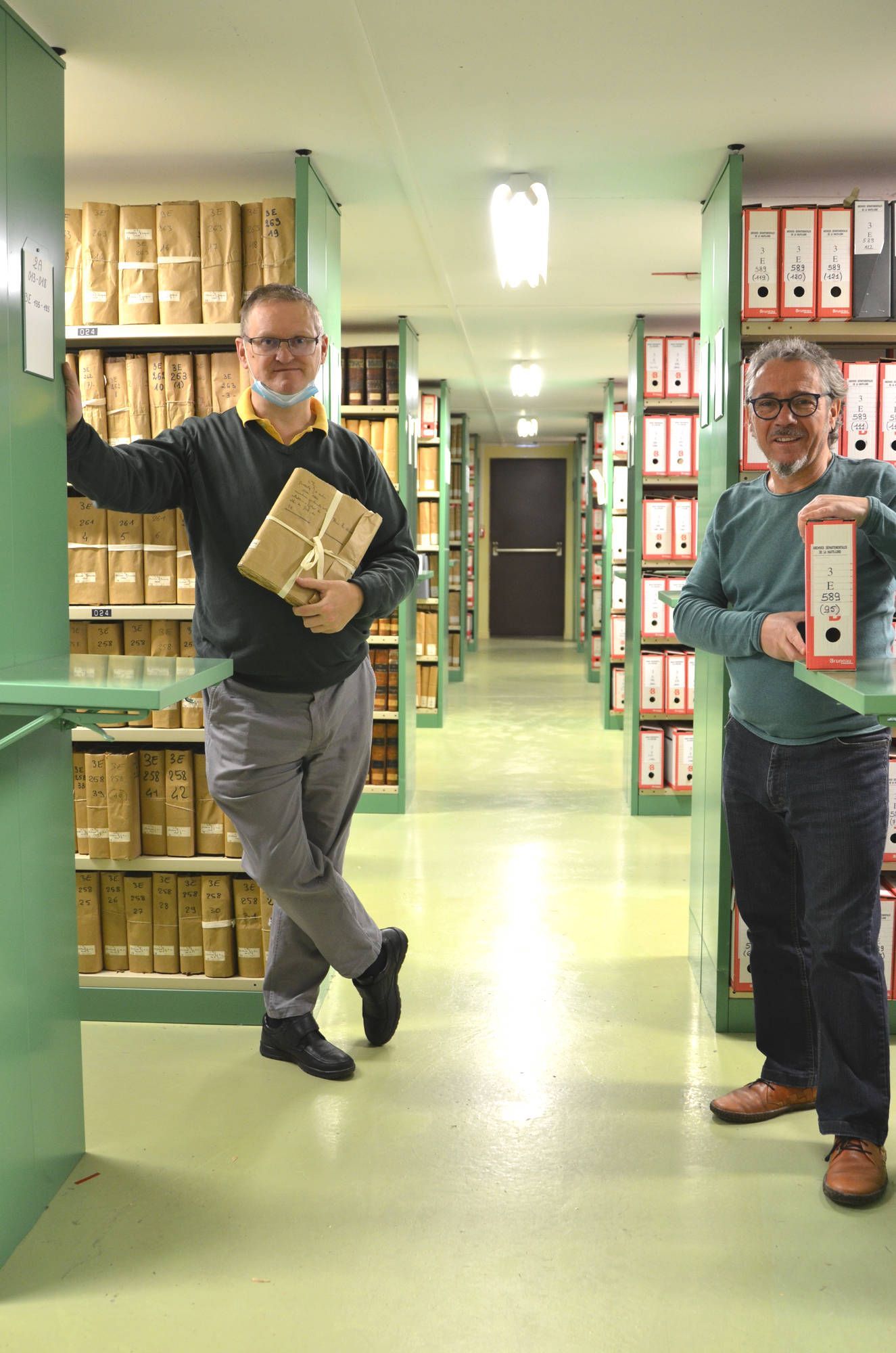 - Pascal et Sylvain sont les artisans de ce projet. L'on pourrait penser que l'opération ne consiste qu'à remplacer les contenants d'origine, bien souvent néfastes pour les documents sur le long terme (les chemises formées de papier kraft très acide attaquent le papier et les boîtes en cartonnette et en bois contenant des parties en métal, ou les boîtes intégralement métalliques, corrodent elles aussi le papier), par des boîtes longue conservation en carton neutre. Cependant le duo veille au grain car le reconditionnement révèle de nombreuses surprises, bonnes et moins bonnes. Pascal et Sylvain vérifient systématiquement le contenu de chaque cote d'archives (registre ou liasse) et parmi les désagréables découvertes, on peut citer des dates extrêmes erronées, des descriptions incomplètes, des lacunes non répertoriées, etc. Le travail de reconditionnement ne se limite donc pas au simple remplacement des contenants mais implique le reclassement et sa conséquence directe, la mise à jour de l'inventaire des fonds de notaires.
