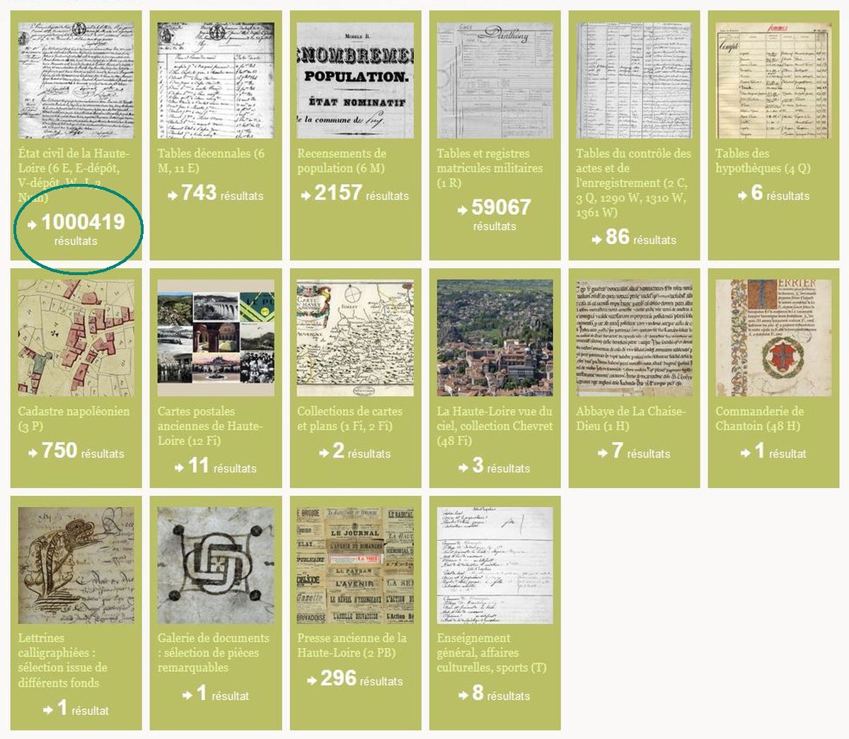 - Sylvain poursuit ce travail bien qu'à un rythme plus modéré, pour la partie état civil. Tous les noms ainsi indexés sont interrogeables à partir du formulaire de recherche du Wikitag des Archives de la Haute-Loire, accessible à partir de l'icône "Wikitag" (en forme d'étiquette) en haut et à droite du menu principal. Cette contribution apportée au travail de relevé et d'indexation systématique des actes d'état civil effectué par les généalogistes bénévoles du groupe Généal43 (dont les relevés sont intégrés au site des Archives départementales depuis 2014), vient de porter le nombre des indexations pour l'état civil à plus d'un million sur le site des Archives départementales !