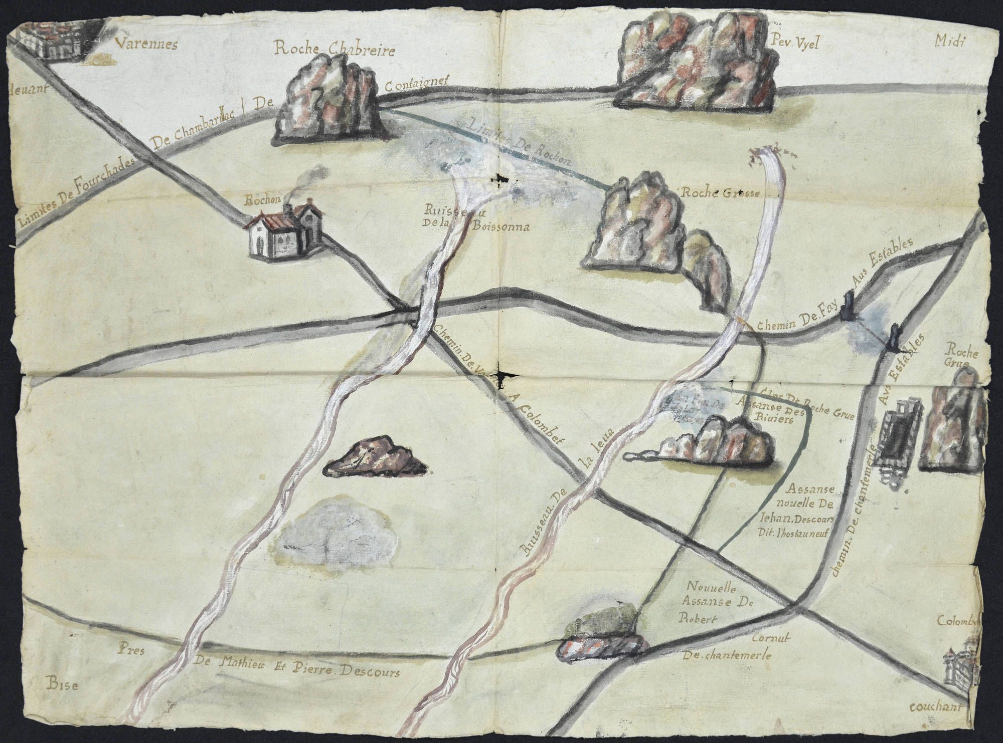 - Ces deux superbes plans de terroir aquarellés datant du XVIIIe siècle, identifiés lors d'une récente recherche, représentent une partie des possessions du couvent de la chartreuse de Bonnefoy, appartenant à l'ordre religieux des Chartreux. Ils sont tirés de la cote 66 H 16 dédiée aux "Terriers et censives" de ce couvent fondé en 1156. Situé sur le mandement du Béage (territoire de l'actuelle commune du Béage en Ardèche), limitrophe de la Haute-Loire, le couvent de la chartreuse de Bonnefoy est installé à plus de 1300 mètres d'altitude dans une vallée à mi-chemin, à vol d'oiseau, entre le mont Mézenc et le mont Gerbier de Jonc, source de la Loire. Les deux plans sont orientés pour l'un au sud-est, pour l'autre à l'est, la visionneuse est donc bien utile pour effectuer les rotations nécessaires à notre lecture accoutumée aux cartes orientées au nord.