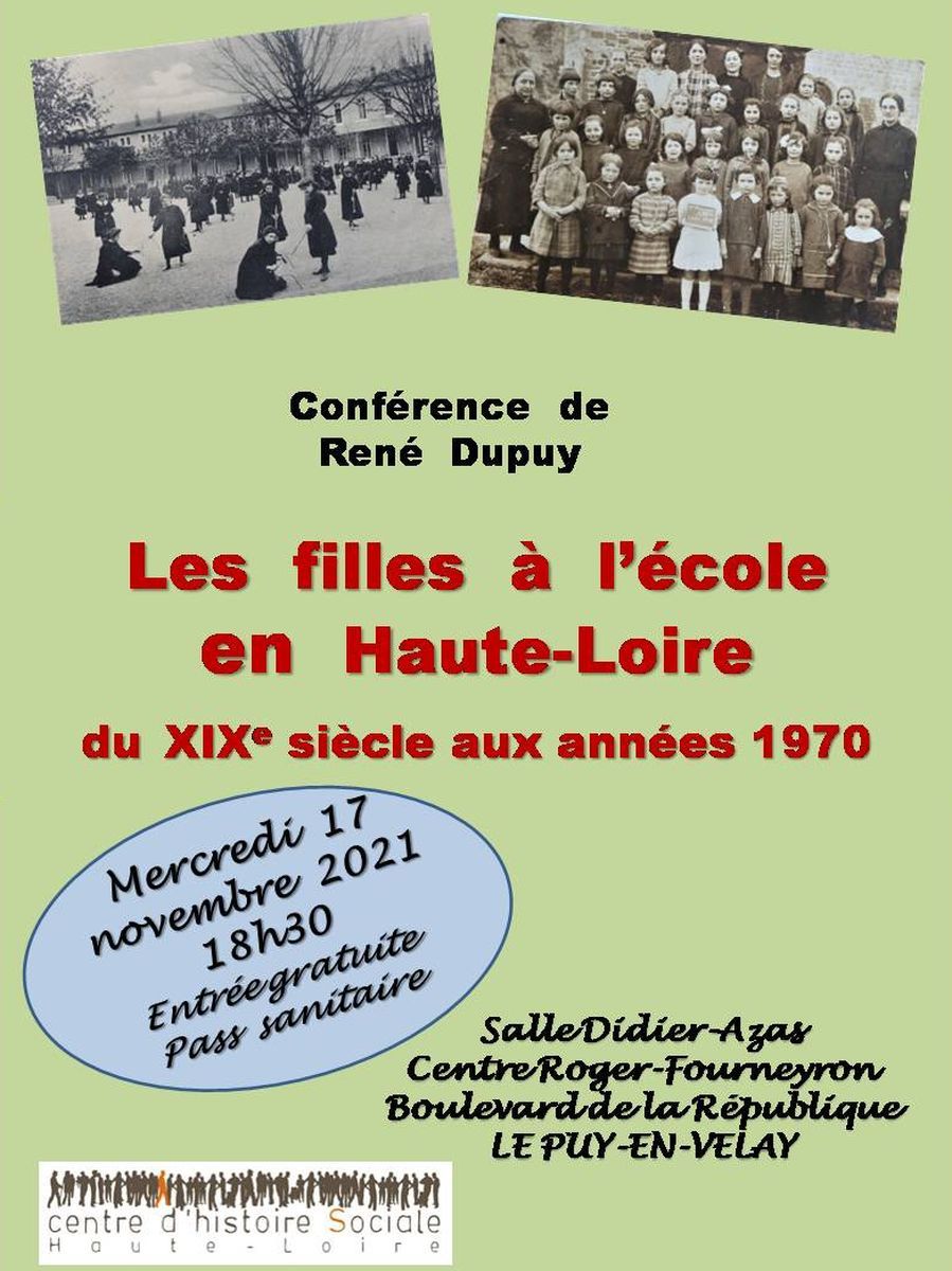 - Le Centre d'histoire sociale de la Haute-Loire propose une conférence mercredi 17 novembre à 18h30 au Centre Roger-Fourneyron, salle Didier Azas (grande salle du rez-de-chaussée), au Puy-en-Velay. René Dupuy traitera de la question "Les filles à l’école en Haute-Loire du XIXe siècle aux années 1970"