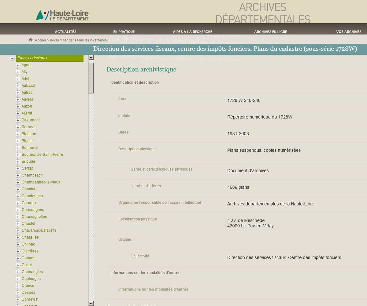 - L'inventaire des plans du cadastre dit "rénové" (sous-série 1728 W), versés en 2007 par la Direction des services fiscaux du Centre des impôts fonciers du Puy-en-Velay, a été mis à jour et est à présent consultable sur notre site. Cet inventaire présente les différents types de plans du cadastre par commune. Apparaît en premier le tableau d'assemblage correspondant au plan général du territoire communal (découpé en sections), puis les plans de sections sur lesquels sont figurées les parcelles cadastrales. Les plans datent des années 1931 à 2003, précisément depuis la loi du 16 avril 1930 qui révise les évaluations foncières et fonde le cadastre moderne, jusqu'aux derniers remaniements avant que la collection de plans édités sur feuilles de polyester ne soit dématérialisée. Les remaniements consistent en une amélioration de la qualité du plan lorsqu’il ne permet plus d'identifier et de déterminer correctement certaines parcelles et immeubles.