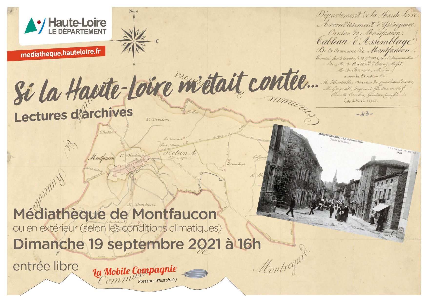 - Dans la foulée de la lecture d'archives donnée à Saint-Haon, la Médiathèque départementale et l'association culturelle La Mobile Compagnie, proposent une autre session du spectacle Si la Haute-Loire m'était contée..., dimanche 19 septembre à 16h à la Médiathèque de Montfaucon-en-Velay, ou en extérieur si le temps le permet.