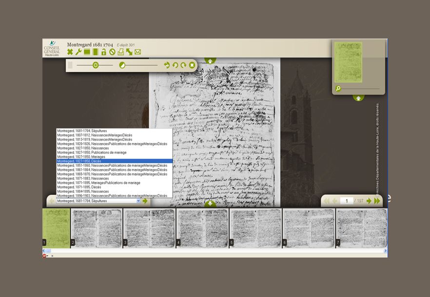 - navigation entre les différents résultats de la recherche sans quitter la visionneuse (liste déroulante de registres) ;