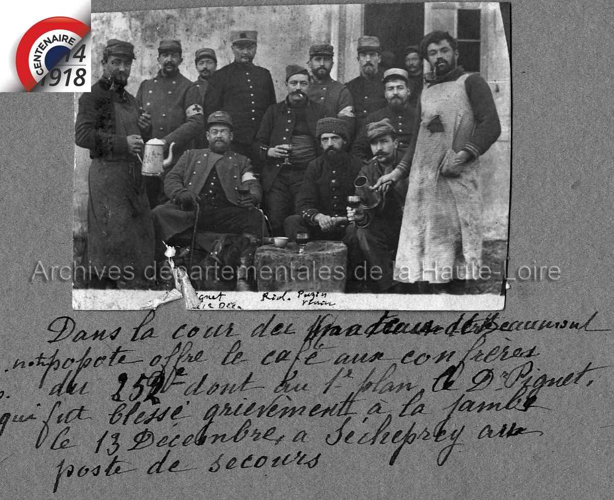 - Organisée par le Comité départemental du centenaire de la Grande guerre coordonné par la Préfecture, cette exposition a été réalisée en collaboration avec les Archives départementales et met en exergue des documents issus des nombreuses contributions de familles du département. C’est le cas de cette photographie, tirée de l’album du docteur Vassel (debout, 4ème en partant de la gauche), médecin au service de santé du 286ème régiment d’infanterie datant de l’automne 1914. Légende : « Dans la cour du château de Beaumont, notre popote offre le café aux confrères du 252ème dont au premier plan le docteur Pignet qui fut blessé grièvement à la jambe le 13 décembre à Sé[ei]cheprey au poste de secours. »