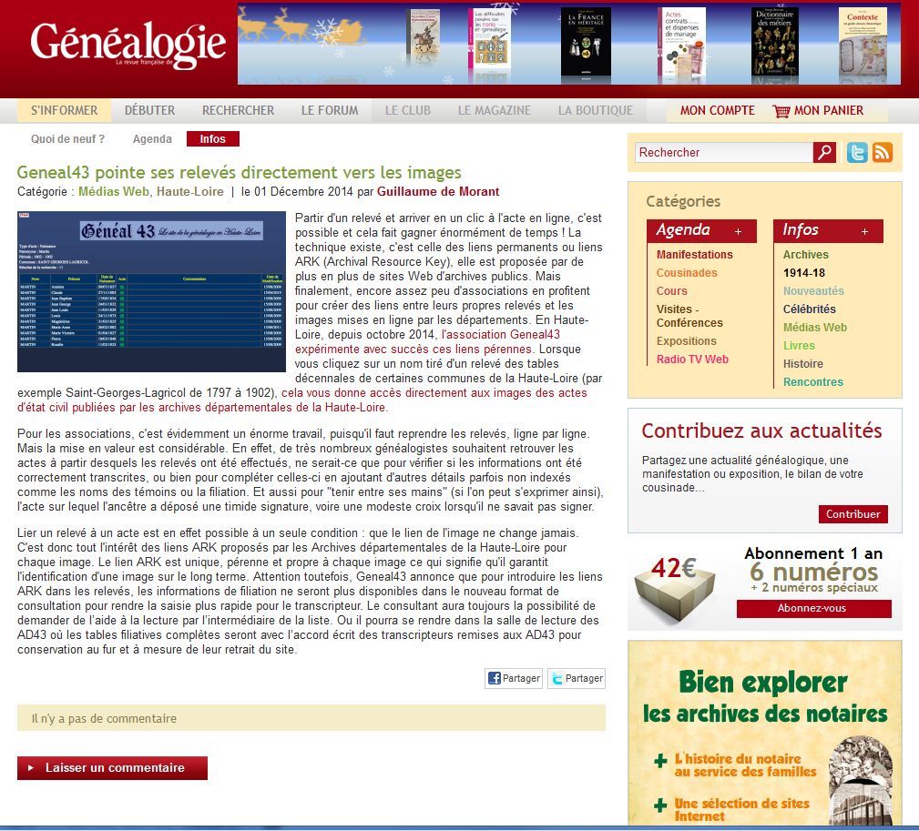 - La Revue française de généalogie (RFG) qui compte des archivistes parmi ses rédacteurs et promeut la généalogie au niveau national, salue dans un article de Guillaume de Morant publié sur son site, le travail réalisé sur le département de la Haute-Loire par les membres du site geneal43.com.