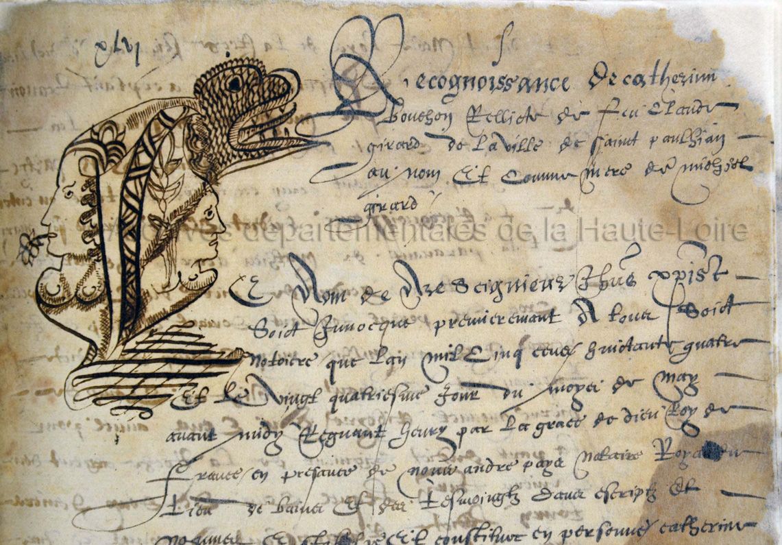 - Les Archives départementales de la Haute-Loire conservent de nombreux documents manuscrits anciens comportant des lettrines calligraphiées avec art. Le terrier pour Louis de Larochelambert qui date de 1584 (cote 1 E 157) est un excellent exemple du travail des scribes de cette période. On constate en effet que les actes de Georges Cheyrol, notaire royal à Saint-Paulien, qui composent ce terrier, débutent très souvent par une lettrine dessinée en forme de tête. Nous avons numérisé l’intégralité de cette galerie de portraits que vous pouvez consulter sur notre site. Un second lot d'images présente le travail de restauration du terrier (vues générales de la couverture, du dos, et des pages).