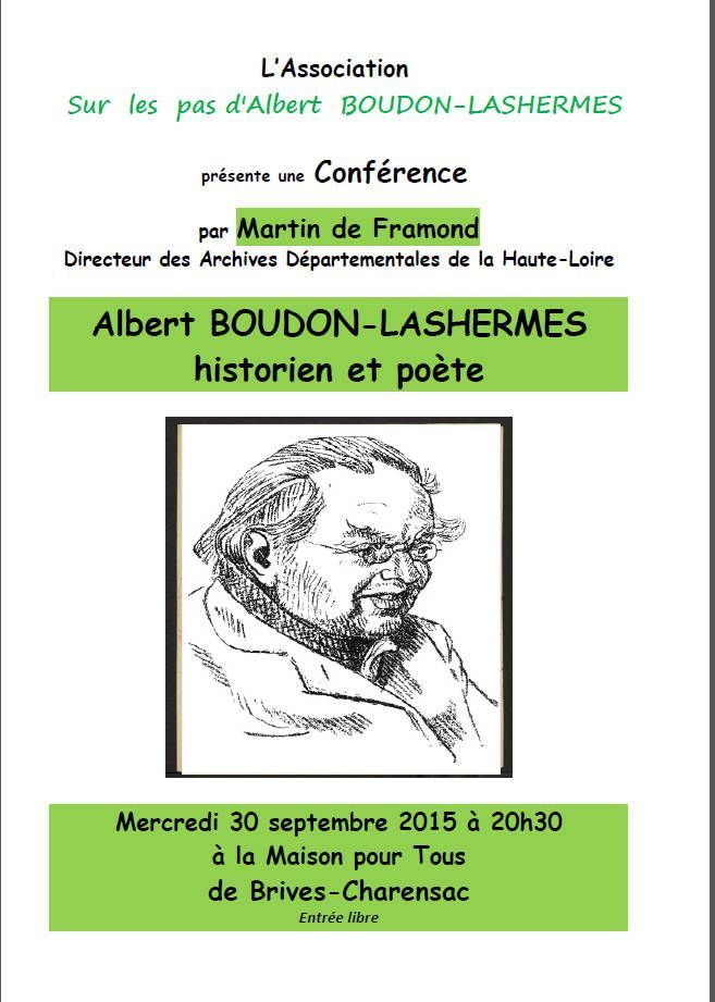 - Mercredi 30 septembre 2015 à 20h30 à la Maison pour tous de Brives-Charensac, l'Association Sur les pas d'Albert Boudon-Lashermes organisera une conférence intitulée « Albert Boudon-Lashermes : historien et poète » donnée par Martin de Framond, Directeur des Archives départementales de la Haute-Loire. Cette conférence, gratuite, sera l'occasion d'échanger sur la vie et l'œuvre d'Albert Boudon-Lashermes, historien du Velay, poète et félibre prolifique de la première moitié du XXe siècle.