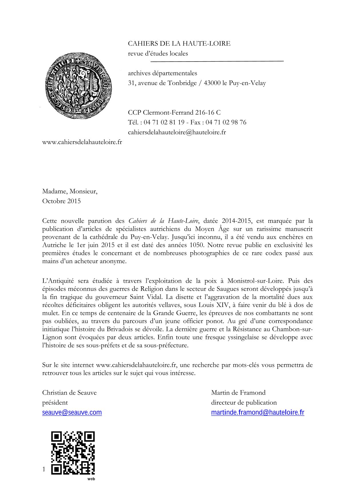 - Le nouveau numéro des sur le site internet Cahiers de la Haute-Loire actuellement sous presse, est en souscription jusqu'au 30 novembre 2015.