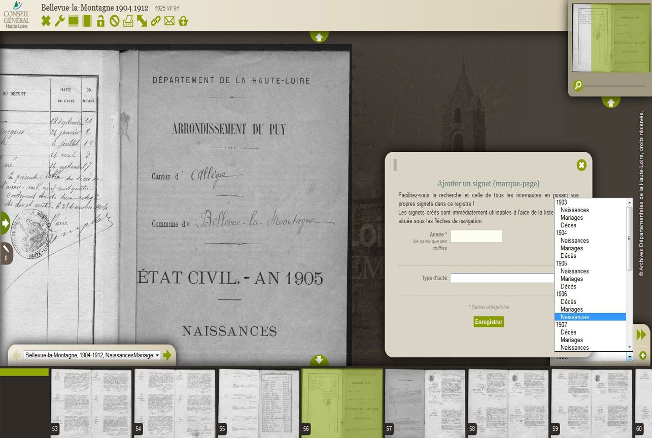 - Les signets intégrés par les Archives départementales de la Haute-Loire sur une partie des registres de l'état civil de 1903 à 1932 à l'occasion de leur mise en ligne en décembre 2014, se sont avérés très utiles selon les nombreux retours des internautes. Nous avons par conséquent choisi de rendre accessible à tous l'outil de création de signets pour l'ensemble de l'état civil et des recensements de population consultables sur notre site.