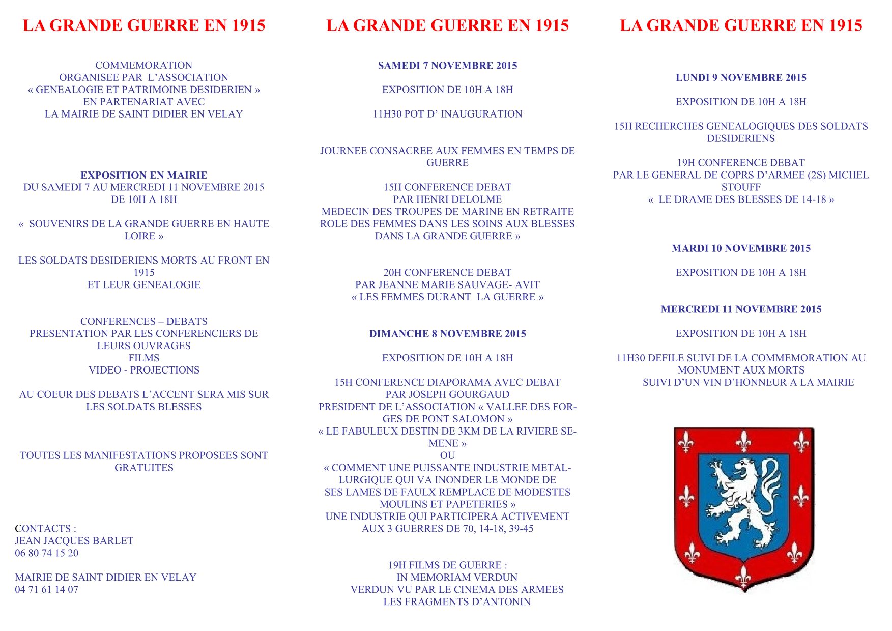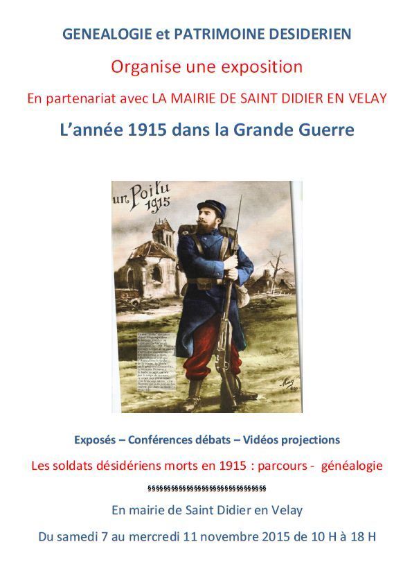 - L’association Généalogie et Patrimoine Désidérien organise en partenariat avec la mairie de Saint-Didier-en-Velay, une exposition intitulée "L’année 1915 dans la Grande Guerre", du samedi 7 au mercredi 11 novembre 2015 de 10H à 18H en mairie de Saint-Didier-en-Velay.