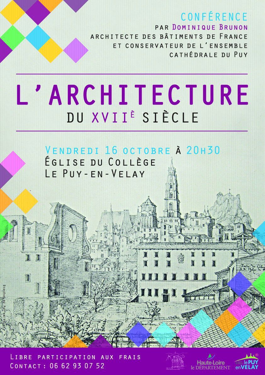- Ce vendredi 16 octobre, c’est Dominique Brunon qui parlera de l’architecture du XVIIe siècle, le thème de la saison 2015 de l’association étant « Les arts au XVIIe siècle ». Architecte des bâtiments de France et conservateur de l’ensemble cathédrale du Puy, Dominique Brunon évoque avec passion le XVIIe siècle quelque peu oublié. La Renaissance et le XVIIIe siècle, ses voisins, lui font de l’ombre.
