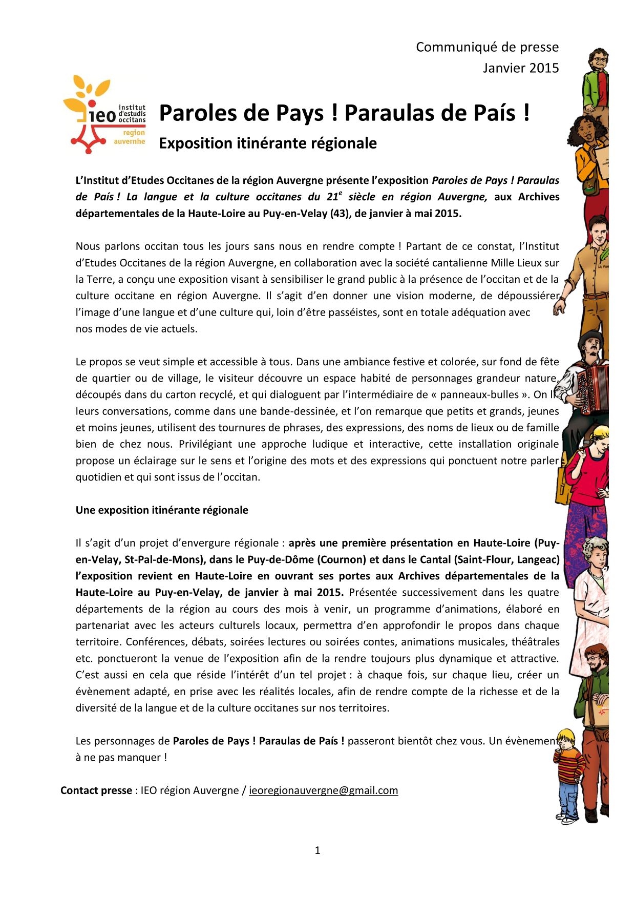 - Les Archives départementales de la Haute-Loire accueillent du 21 janvier à la fin du mois de mai 2015, l'exposition itinérante régionale Paroles de Pays ! Paraulas de Païs ! La langue et la culture occitanes du XXIe siècle en région Auvergne, réalisée par l’Institut d’Études Occitanes/Institut d'Estudis Occitans de la région Auvergne en collaboration avec la société cantalienne Mille Lieux sur la Terre.
