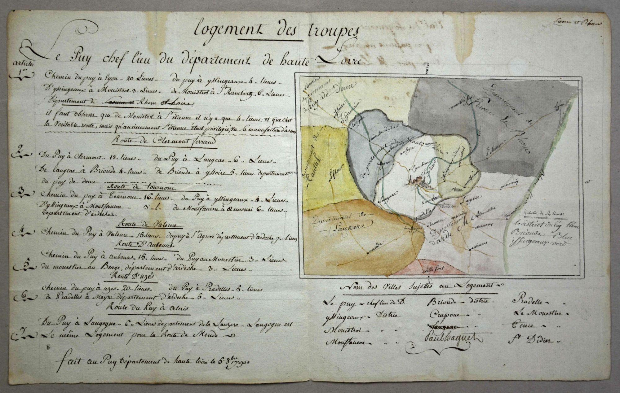 - Tiré de la sous-série 2 L (dossiers de l’administration du département de la Haute-Loire d'époque révolutionnaire), bureau du représentant de l’État auprès du département, ce document est un état du logement des troupes partant au Puy. Les différentes étapes dans le département sont listées, les distances et le nom des villes sujettes au logement des troupes sont indiqués. Ce document a été remis par M. Lambert, « étapier » de la ville du Puy. Il est illustré d’une carte en couleurs sur laquelle on reconnaît les districts du Puy, (blanc), de Brioude (bleu) et d’Yssingeaux (vert). Les districts forment alors le second niveau de l’organisation administrative du pays.