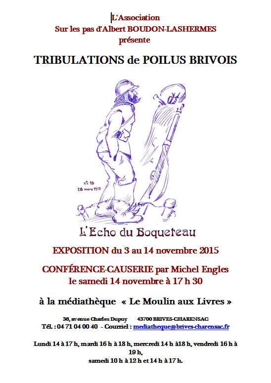 - L'association "Sur les pas d'Albert Boudon-Lashermes" organise à la médiathèque "Le moulin aux livres" de Brives-Charensac, l'exposition et la conférence intitulées "Tribulations de Poilus brivois". Michel Engles partage à cette occasion avec l'auditoire les souvenirs et péripéties vécues par son grand-père en cette période de guerre : l'enthousiasme revanchard, la déception, l'effroi.