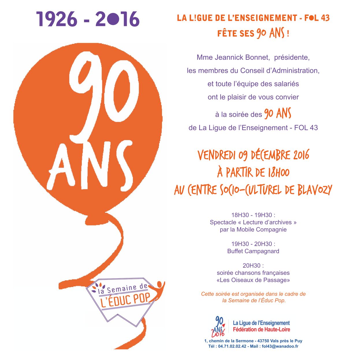 - La Ligue de l'Enseignement de Haute-Loire (Fédération des Œuvres laïques), mouvement d’éducation populaire, organise à l'occasion de ses 9O ans, un évènement anniversaire au cours duquel sont proposés une « Lecture d’archives » (interprétée par La Mobile Compagnie), une soirée chansons françaises (animée par Les Oiseaux de Passage) et un buffet campagnard. Cette soirée est organisée dans le cadre de la Semaine de l’Éducation populaire et se tiendra vendredi 9 décembre 2016 à partir de 18H00 au Centre Socioculturel de Blavozy. L'entrée est libre dans la mesure des places disponibles.