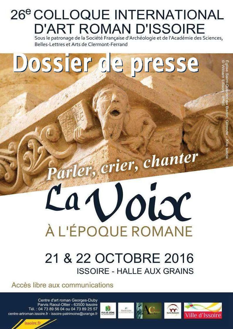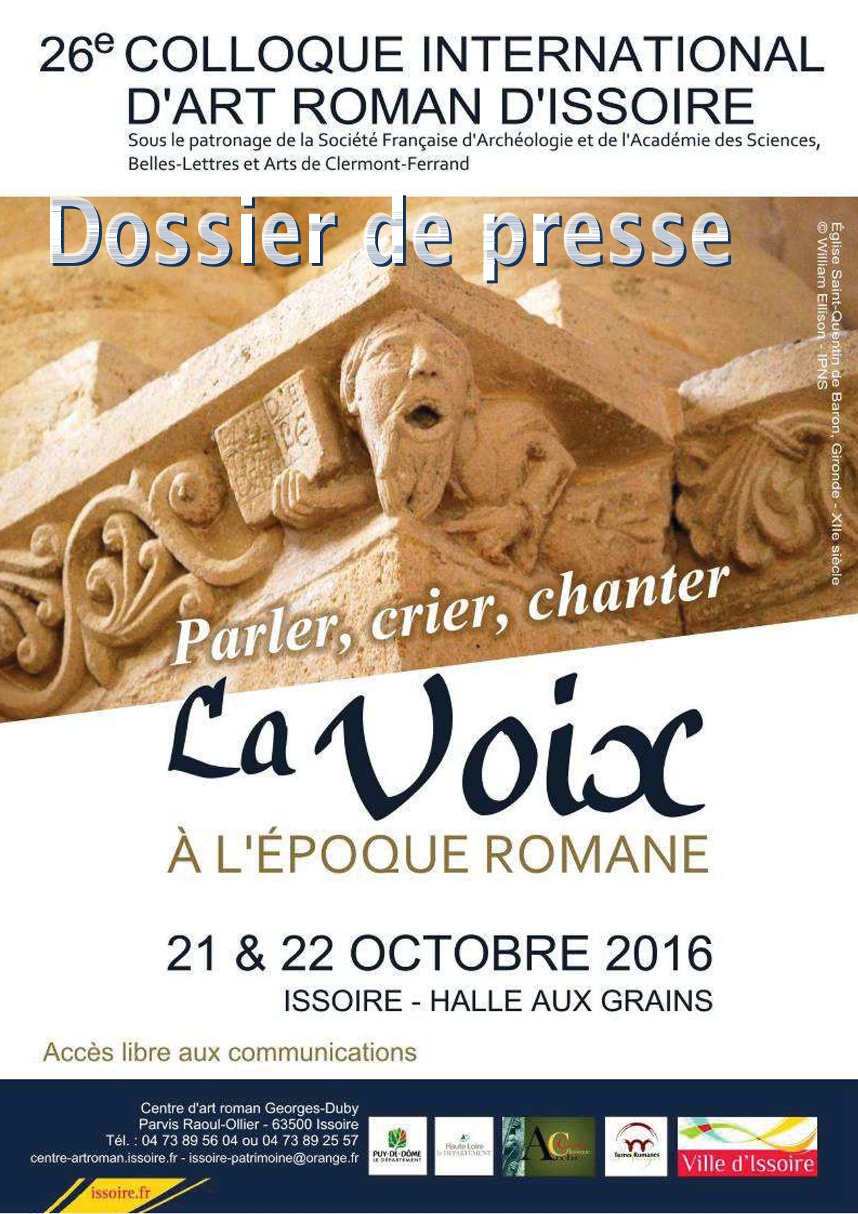 - Le 26ème colloque international d'art roman d'Issoire, organisé sous le patronage de la Société française d'archéologie et l'Académie des sciences, belles-lettres et arts de Clermont-Ferrand, se tiendra les 21 et 22 octobre 2016 et sera consacré à la voix à l'époque romane.