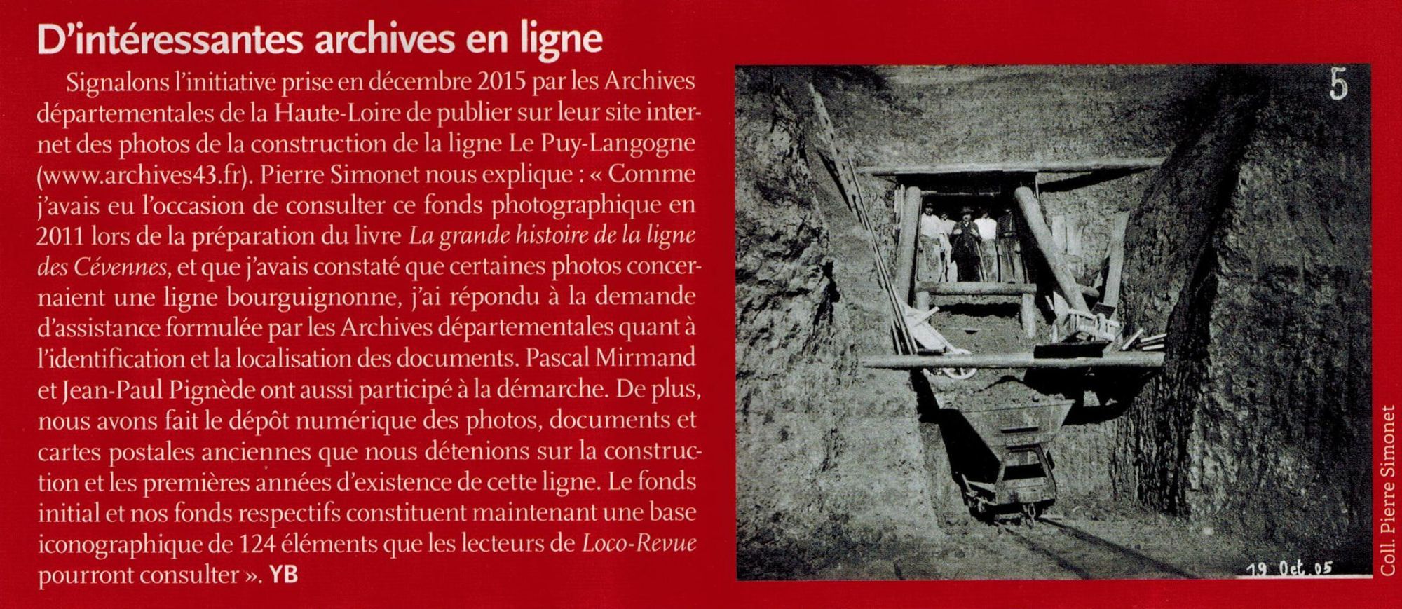 - Pierre Simonet, à l'origine avec Jean-Paul Pignède de nombreuses corrections de légendes et d'identifications de photographies du fonds relatif à la construction de la ligne de chemin de fer Le Puy-Langogne, nous a indiqué cet été la parution d'un article dans le magazine Loco-Revue (numéro de juillet 2016). L'article souligne l’initiative prise par les Archives départementales de la Haute-Loire quant à la mise en ligne sur son site internet de ce fonds (voir également notre actualité du mois d'avril 2016). Le rédacteur en chef, Yann Baude, signale l’intérêt que représente pour les internautes cet accès aux images et à l'historique de la construction de la ligne. Nous apprécions ce retour positif de la part d'un autre spécialiste des questions ferroviaires.