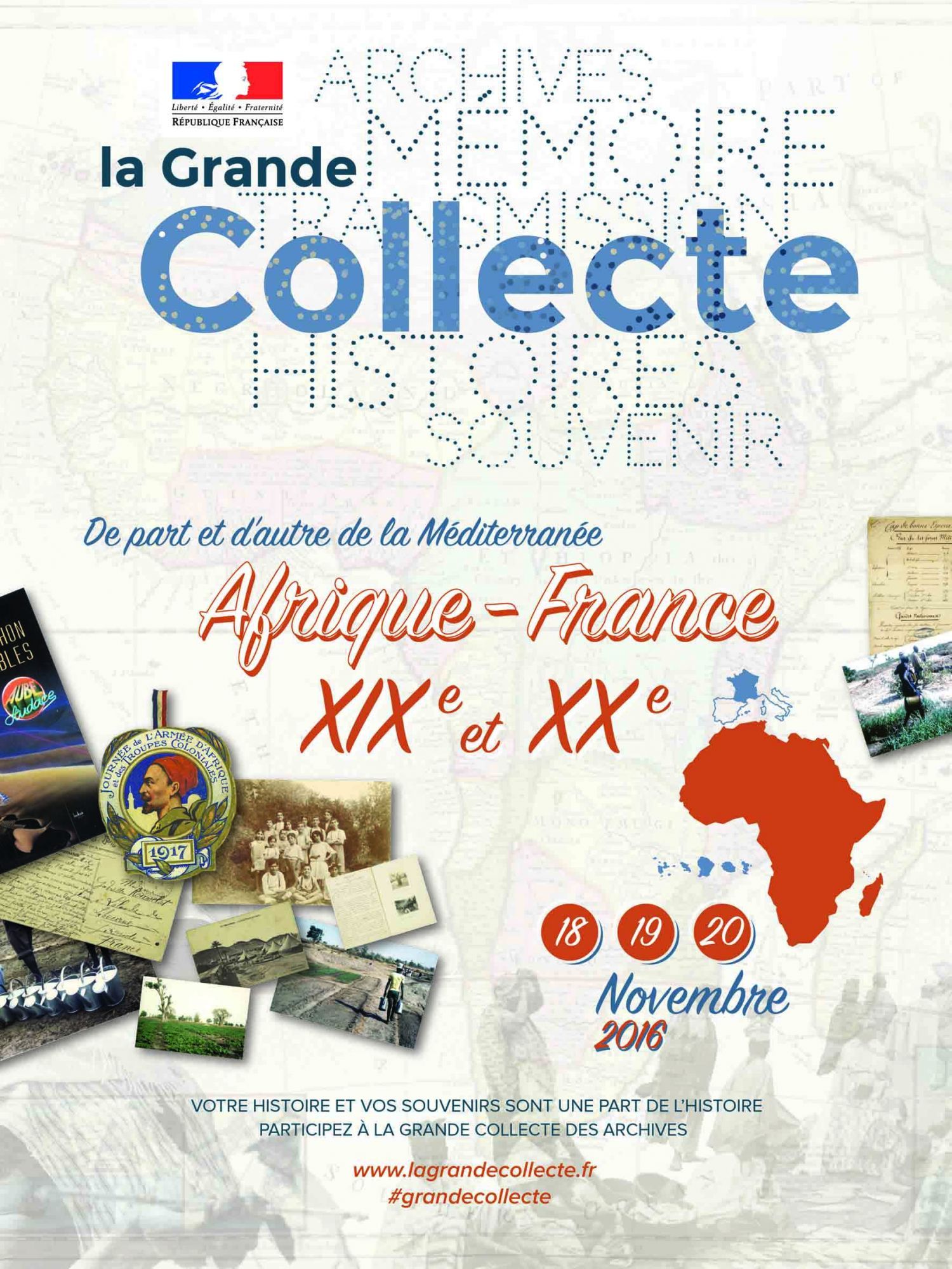 - Comme annoncé dans cette actualité du 17 octobre dernier, la Grande collecte organisée par les Archives de France se poursuit sur tout le territoire national. Le thème retenu cette année est dédié aux relations entre la France et l’Afrique et s'intitule "D’une rive à l’autre de la Méditerranée : l’Afrique et la France aux XIXe et XXe siècles".