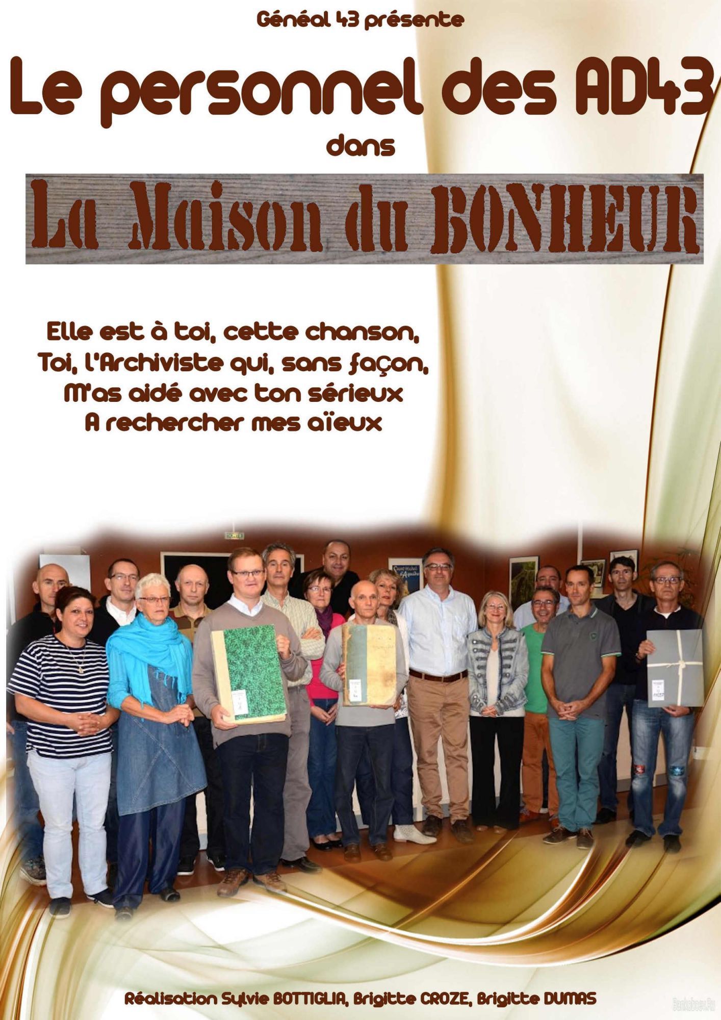 - Afin de remercier les participants présents au salon de la généalogie 2016, les membres de l'association Généalogie43 et du groupe geneal43 ont, avec humour, détourné et personnalisé des affiches de films, remises pendant le salon aux intéressés. Un clin d'œil était également réservé à l'équipe des Archives départementales de la Haute-Loire, pour "son accueil et l'aide apportée en général lors des recherches effectuées aux Archives départementales".