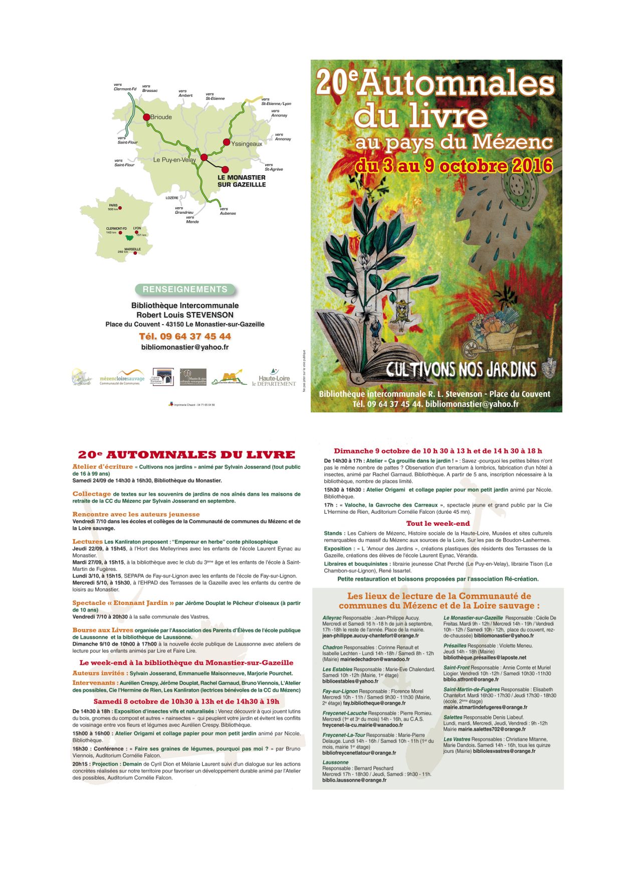 - La Bibliothèque intercommunale du Mézenc et de la Loire sauvage organise les XXe Automnales du livre au pays du Mézenc du samedi 8 au dimanche 9 octobre 2016.