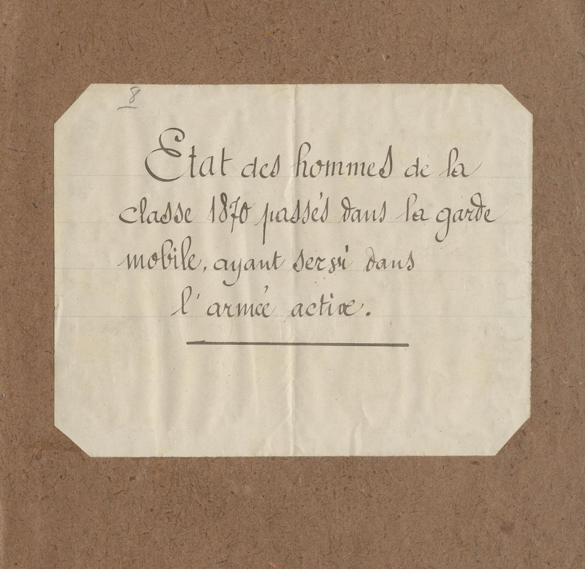 - La collection de tables et registres matricules militaires du fonds du Service du recrutement (sous-série 1 R) vient d'être augmentée avec l'ajout des listes de conscrits ayant été incorporés dans la garde nationale (1 R 771 à 1 R 772-A), des listes du contingent (1 R 772-B à 1 R 774 et 1 R 776 à 1 R 779) et des fiches matricules (1 R 775 et 1 R 780). Ces documents concernent les classes 1865 à 1871.