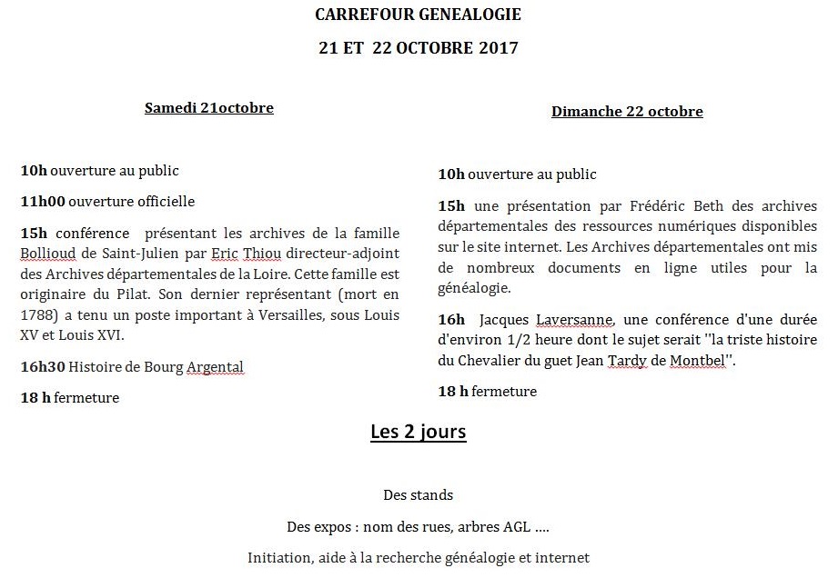 - L'association Les Amis de Bourg-Argental organise le premier Carrefour généalogique les 21 et 22 octobre 2017 à Bourg-Argental dans la Loire. Les départements de la Loire, de la Haute-Loire et de l'Ardèche intéressent les chercheurs de Bourg-Argental comme le montre le fond de carte de l'affiche. Rendez-vous dans la salle André Jamet, allée du 8 mai 1945 à Bourg-Argental, de 10h à 18h.