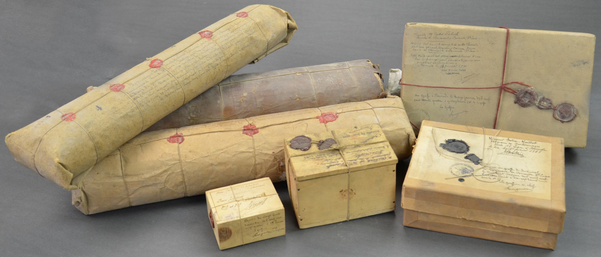 - Cette sélection d'images présente quelques échantillons non descellés, en boîtes de bois ou rouleaux de carton, tels qu'à leur arrivée au tribunal de commerce de Brioude entre 1875 et 1938. Les conditionnements révèlent que les échantillons concernent des lots à franges pour parquets, des cartonnages pliables, des modèles de dentelles et des dessins de lames pour la découpe du bois.