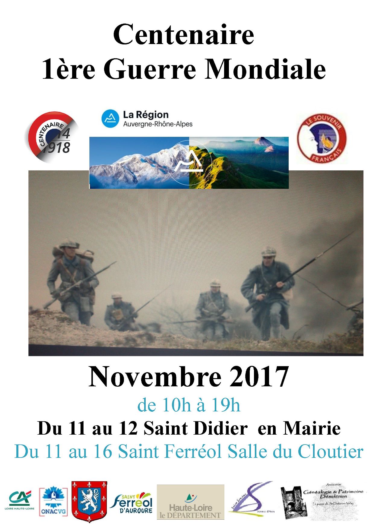 - L’Association Généalogie et Patrimoine Désidérien organise, en partenariat avec la Communauté de communes Loire-Semène, les communes de Saint-Didier-en-Velay et de Saint-Ferréol-d’Auroure, une semaine de commémoration du Centenaire de la Grande guerre du 11 au 16 novembre 2017, de 10h à 19h.