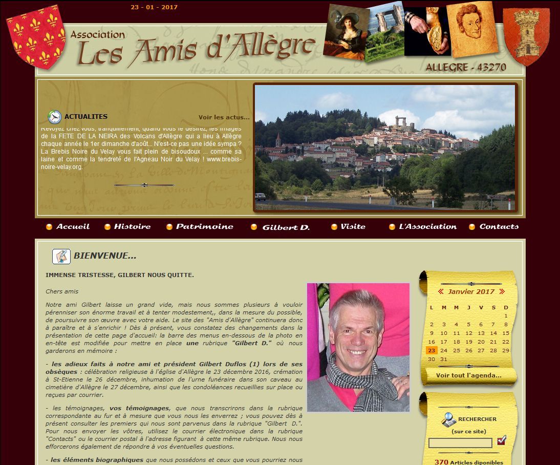 - Gilbert Duflos, président de l'association Les Amis d’Allègre et chroniqueur à Radio Craponne, est décédé le 19 décembre dernier. Œuvrant au développement touristique et historique de la ville d'Allègre et conseiller municipal de 2002 à 2008, Gilbert Duflos était également bien connu en salle de lecture des Archives départementales de la Haute-Loire.