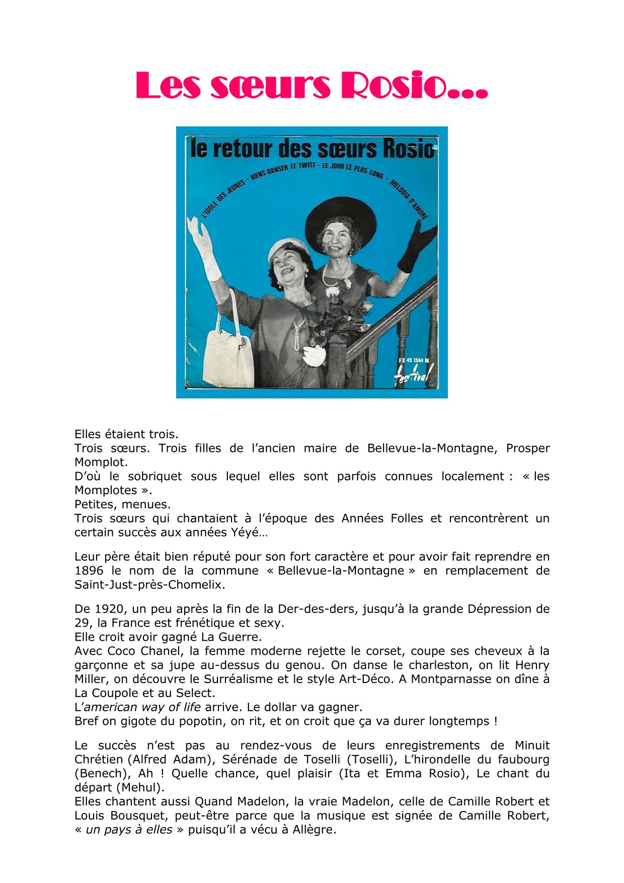 - De nombreux hommages lui ont été rendus ces jours-ci et bien sûr, le site des Amis d'Allègre propose sur cette page quelques éléments biographiques le concernant. Les Archives départementales de la Haute-Loire entament la création d'une base des noms et portraits de femmes remarquables de Haute-Loire ou ayant marqué l'histoire du département de la Haute-Loire, tel qu'annoncé dans une actualité récente. C'est à ce titre (mais il y en auraient bien d'autres) que les Archives départementales saluent à leur tour son engagement culturel dans l'écriture de l'histoire locale en signalant le travail de Gilbert Duflos réalisé à l'automne 2016, sur "Les sœurs Rosio...". Ita et Emma, originaires de Bellevue-la-Montagne et filles de Prosper Momplot (d'où leur surnom local "les Momplotes"), forment un duo chantant au début des années 60, à l'origine de reprises de grands succès du moment assez inattendues et non dénuées de fantaisie.