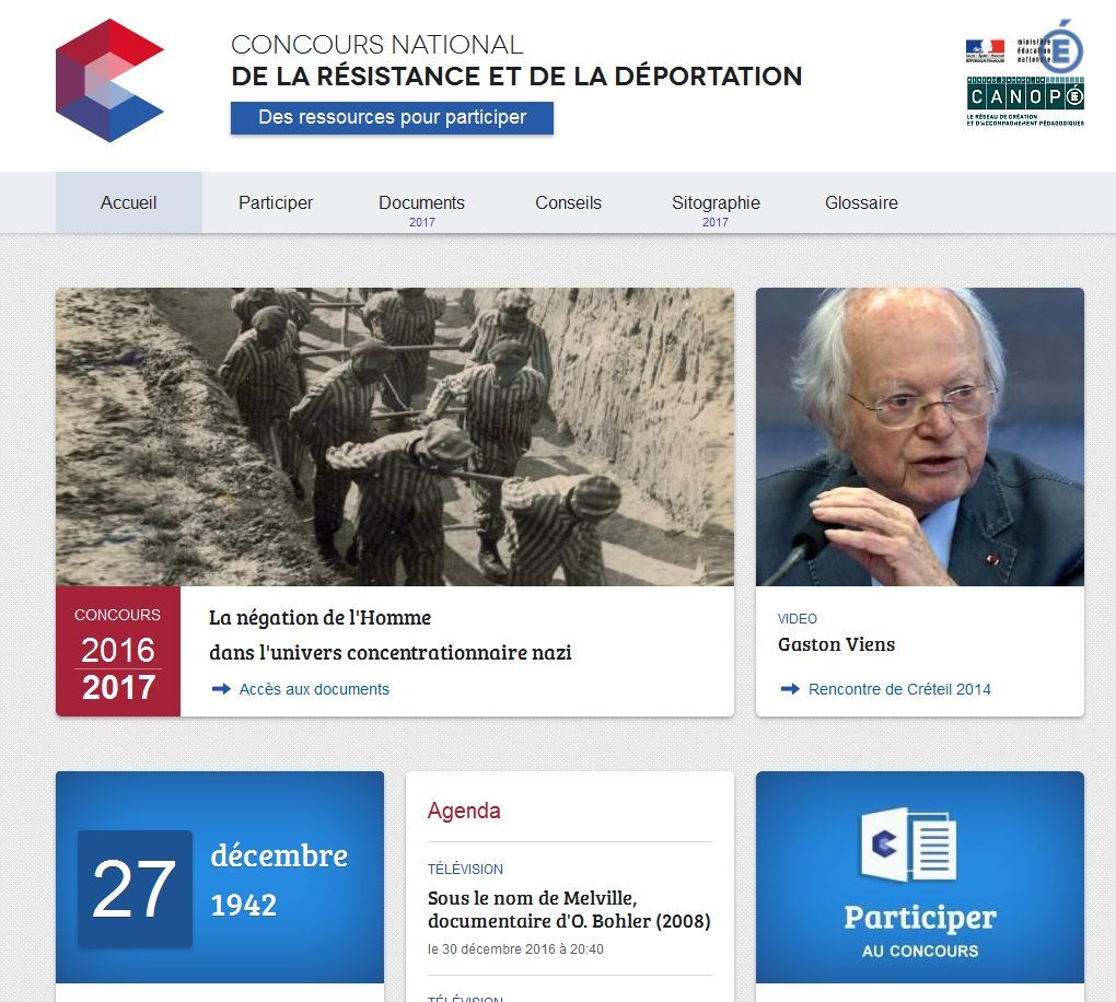 - Le thème du Concours National de la Résistance et de la Déportation 2017 s'intitule "La négation de l'Homme dans l'univers concentrationnaire nazi". Comme le précise le site CANOPÉ, ce concours scolaire s'appuie sur l'enseignement de l'histoire de la Résistance et de la Déportation et s'inscrit dans l'éducation à la citoyenneté. Il a pour objectif de perpétuer chez les jeunes générations la mémoire de cette période de l'Histoire afin de leur permettre de s'en inspirer dans leur vie d'aujourd'hui en s'appuyant sur la formation et les leçons historiques et civiques que leur apporte l'École. Le site CANOPÉ met en ligne un large choix de ressources très utiles pour y participer.