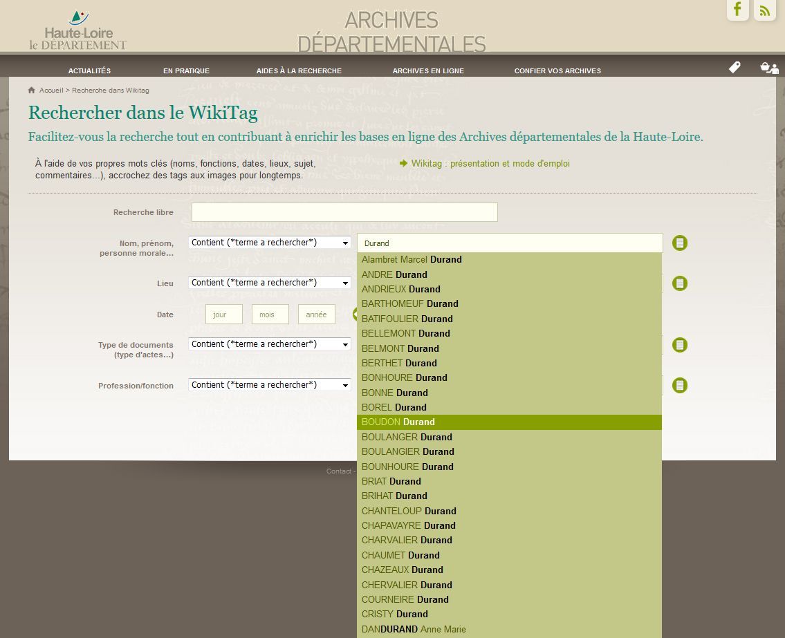 - Suite aux inquiétudes liées à la question de la captation des images des registres paroissiaux et d'état civil en ligne par la société Filae, ressenties récemment et en particulier lors du salon annuel de la généalogie qui se tenait ces 27 et 28 mai derniers, les Archives départementales de la Haute-Loire tiennent à rassurer les bénévoles qui effectuent des relevés d'actes. Les indexations (ou relevés, ou annotations, ou tags...) mises en ligne sur le site des Archives départementales ne sont pas captées par Filae, qu'elles soient réalisées ponctuellement par les internautes à l'aide de l'outil Wikitag ou qu'elles soient importées systématiquement grâce aux liens ARK dans le cadre de la collaboration avec le groupe de bénévoles Généal43. Ce sont les images numériques des registres et non vos indexations qui ont fait l'objet de cette captation !