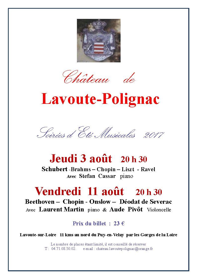 - Deux concerts sont proposés dans le cadre des Soirées d'été musicales 2017 au château de Lavoûte-Polignac les 3 et 11 août prochains. Au programme : Schubert, Brahms, Chopin, Liszt, Ravel, Beethoven, Onslow, Déodat de Séverac.