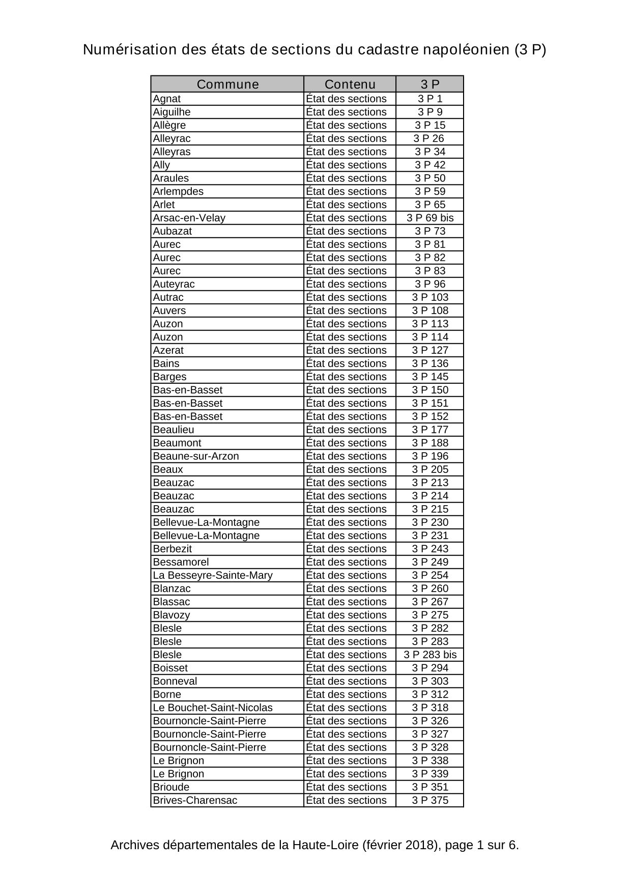 - Les registres des états de sections du cadastre napoléonien versés par les services fiscaux du département de la Haute-Loire (sous-série 3 P), sont en cours de numérisation. Ces documents qui facilitent l'accès et la lecture des plans du cadastre napoléonien, seront indisponibles à la communication en salle de lecture des Archives départementales au cours du premier semestre 2018. La numérisation de ces documents permettra à la fois de préserver les registres originaux très consultés (et qui comme le montre l'image en illustration de cette page, sont fort abîmés à force de manipulation) et de valoriser leur contenu grâce à leur mise en ligne. 330 registres concernant l'ensemble des communes du département sont concernés par cette opération de numérisation.