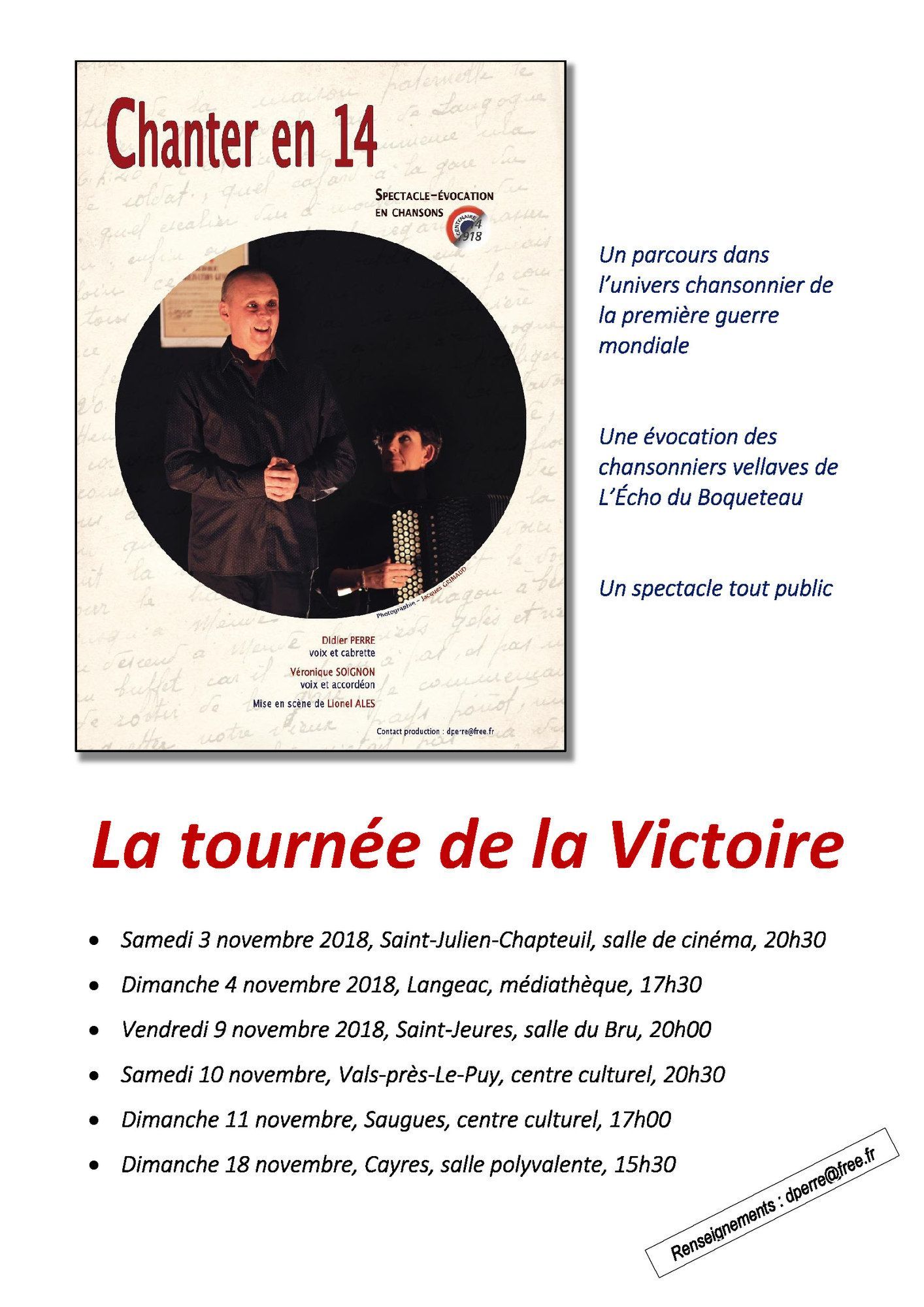 - Le spectacle "Chanter en 14" dont nous avions déjà parlé en 2016 (voir cette actualité), se poursuit cette année avec une nouvelle création intitulée "La tournée de la Victoire". Didier Perre (voix et cabrette) et Véronique Soignon (voix et accordéon) nous proposent un parcours, mis en scène par Lionel Ales, dans l’univers chansonnier de la première guerre mondiale. Cette évocation des chansonniers vellaves de L’Écho du Boqueteau (journal de tranchées) s'adresse à tous les publics.