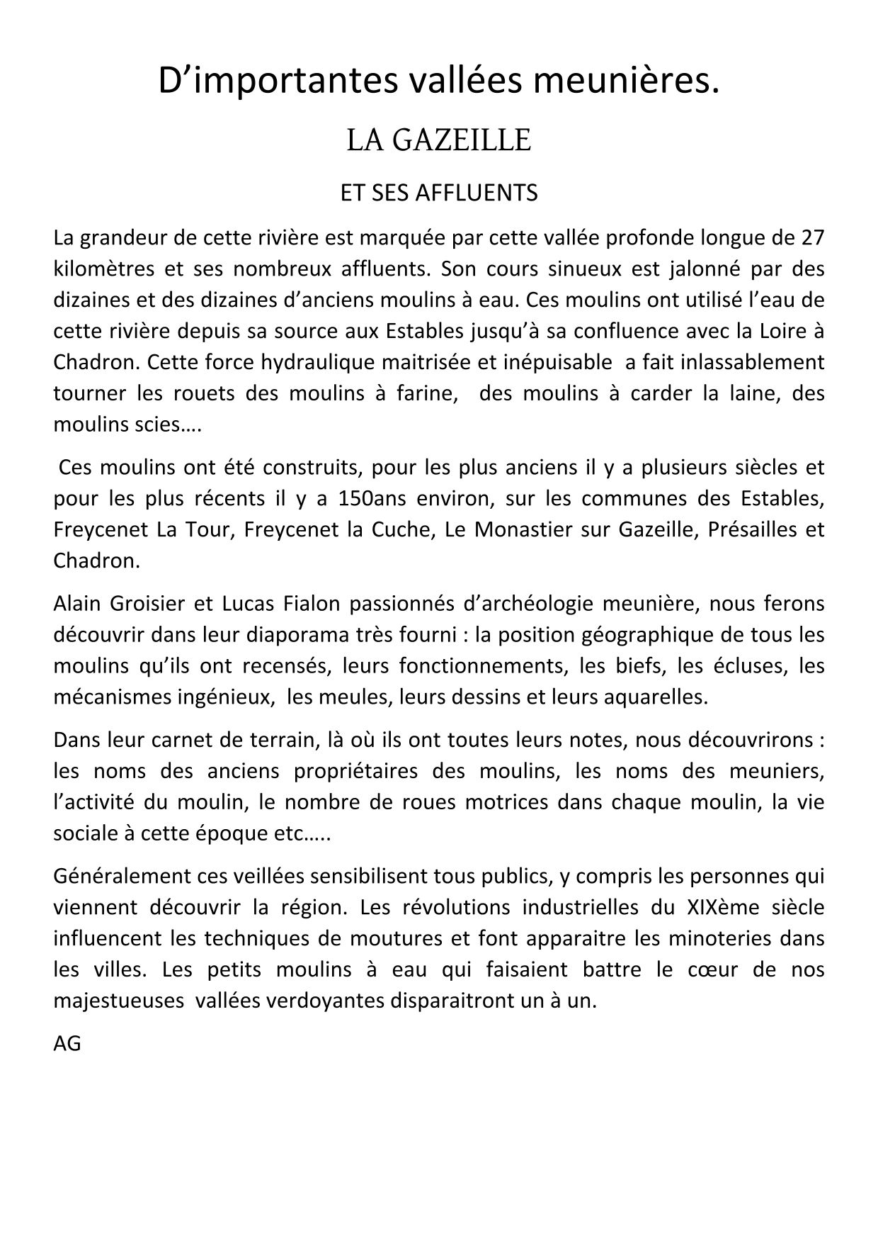 - Alain Groisier et Lucas Fialon, soutenus par l’Espace Culturel Européen, présentent ce samedi 6 octobre à 20h à l’auditorium Cornélie Falcon au Monastier-sur-Gazeille, leurs travaux documentés sur l’étude historique et géographique de tous les moulins qui ont existé sur la rivière La Gazeille entre Les Estables et Chadron. Ils s'appuient au cours de cette veillée, sur un diaporama très fourni exposant les nombreux moulins qui ont fait vivre la vallée pendant plusieurs siècles.