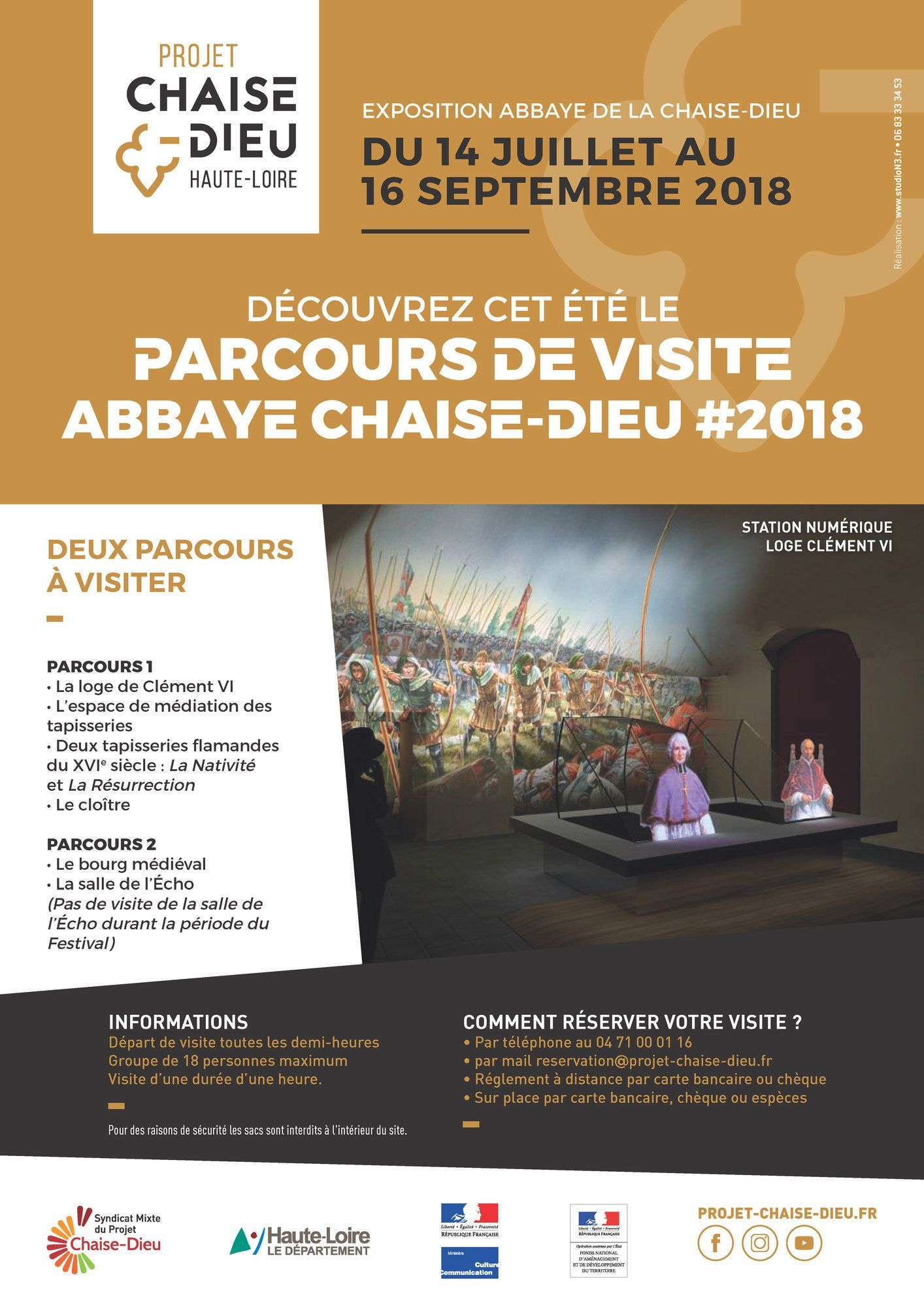- Le futur parcours muséographique permettant de découvrir l’architecture et l’histoire de l’Abbaye de La Chaise-Dieu ouvrira progressivement en 2018, 2019 et 2020. Dès cet été, du 14 juillet au 16 septembre 2018 pour être précis, le Syndicat Mixte du Projet Chaise Dieu propose cinq espaces de visite via deux parcours différents :