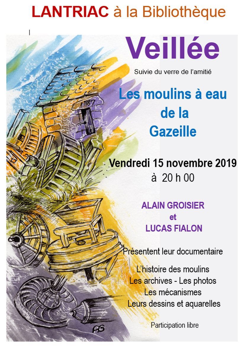 - Après leurs veillées d’été autour des anciens moulins à eau qui jalonnaient le remarquable cour d’eau l’Orcival entre le Béage et Issarlès, Alain Groisier et Lucas Fialon présentent leur documentaire sur le thème des "55 moulins à eau de la Gazeille" à la bibliothèque de Lantriac, vendredi 15 novembre à 20h. Ce cour d’eau et ses affluents traversent les communes des Estables, Freycenet-la-Cuche, Freycenet-la-Tour, Présailles, Le Monastier-sur-Gazeille, Saint-Martin-de-Fugères et Chadron. En savoir plus sur le site Le gouyard et la plume.