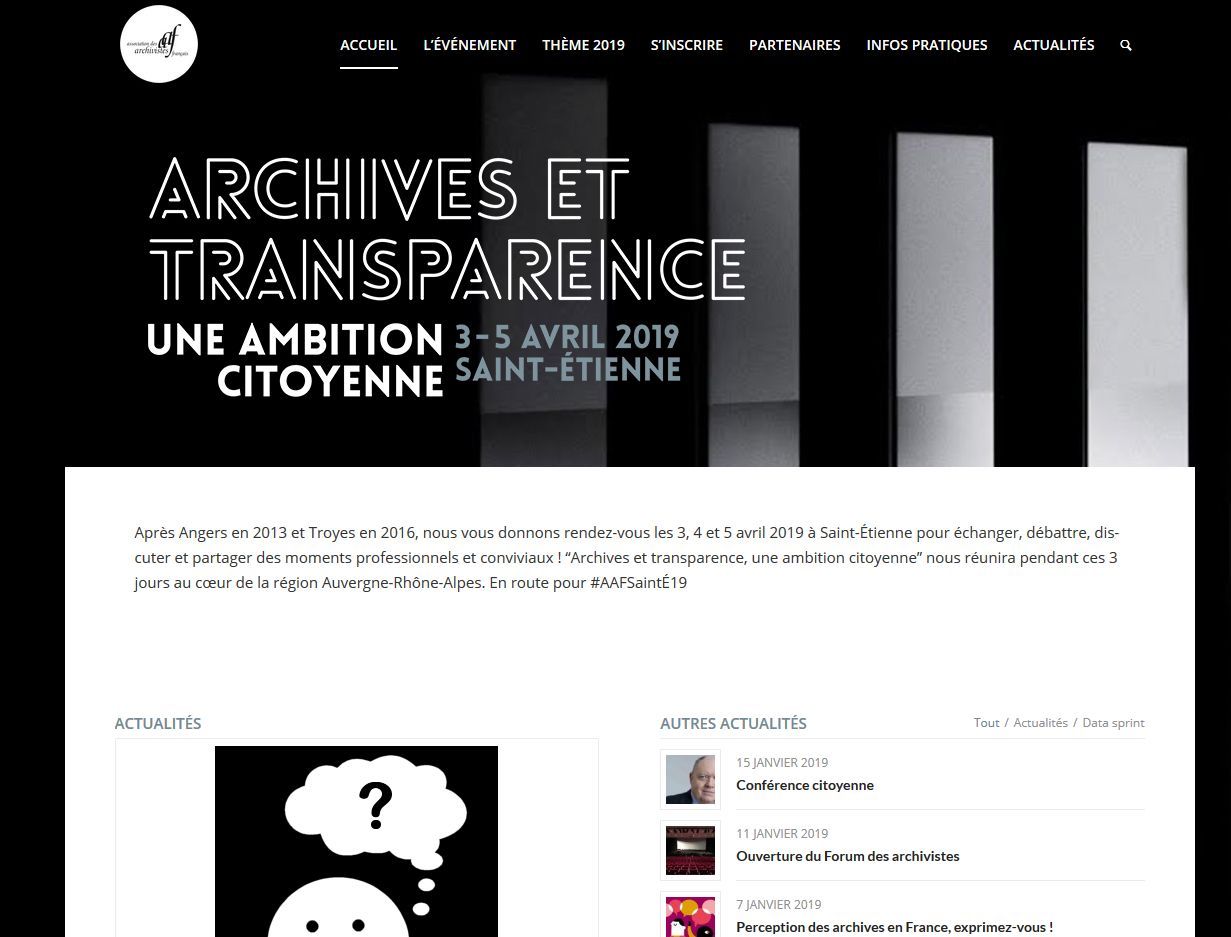 - Organisé par l’Association des archivistes français, le forum des archivistes 2019 intitulé "Archives et transparence, une ambition citoyenne", a lieu cette année du 3 au 5 avril 2019 à Saint-Étienne. Les professionnels des secteurs public et privé se retrouvent pour échanger et débattre à l'occasion de conférences, ateliers et tables rondes. La manifestation accueille également durant ces trois jours, un espace d’échanges et d’informations sur les métiers des archives destiné en particulier aux étudiants ainsi qu'un salon d’exposition commerciale ad hoc (présentation d’outils et de logiciels spécialisés).