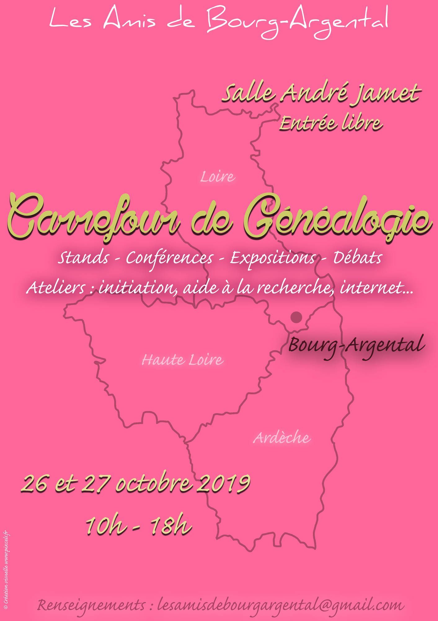- L'association Les Amis de Bourg-Argental organise son second Carrefour généalogique les 26 et 27 octobre 2019 à Bourg-Argental dans la Loire. Située au centre d'une zone formée par les trois départements de la Loire, de la Haute-Loire et de l'Ardèche, Bourg-Argental est un lieu idéal pour rassembler les chercheurs généalogistes de toute cette zone géographique. Rendez-vous est donné dans la salle André Jamet, allée du 8 mai 1945 à Bourg-Argental, de 10h à 18h.