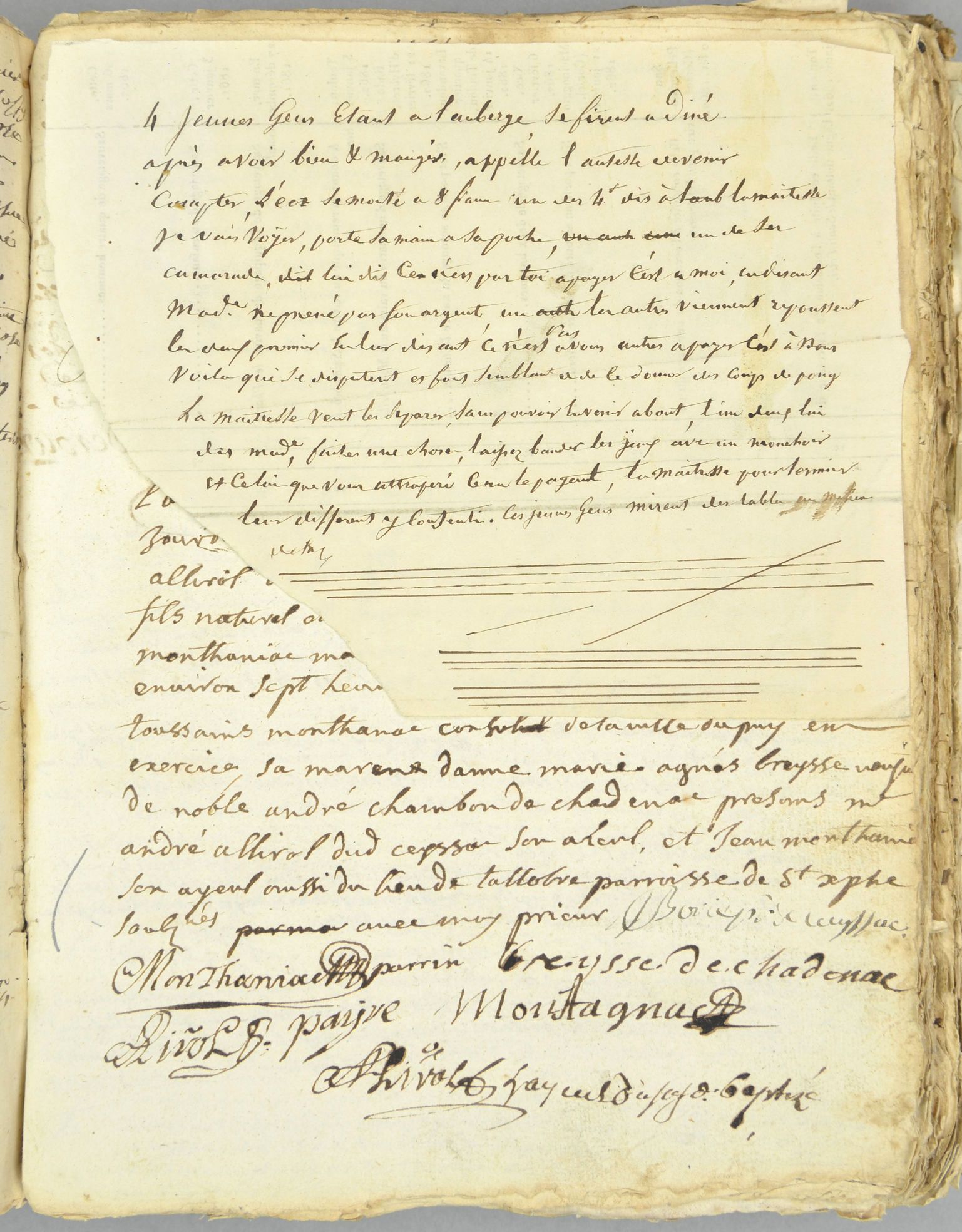 - Les registres paroissiaux et d'état civil contiennent parfois des pages inattendues, les généalogistes amateurs le savent bien. Ce registre issu de la collection communale déposée de la commune de Ceyssac (E-dépôt 143/1), contient une page volante à la fin des actes de l'année 1734 sur laquelle est rédigé un court texte romancé. Ces quelques lignes racontent un épisode concernant un groupe de jeunes hommes dont deux d'entre eux, après avoir bien dîné à l’auberge, font semblant de se battre pour avoir à payer la note se montant à 8 francs. La maîtresse de l’établissement tente de s’interposer sans succès. L’un des deux compères propose qu’elle leur bande les yeux et que celui qui l’attrape soit celui qui acquitte la note, ce à quoi elle consent afin d’en terminer. Les deux complices déplacent alors les tables pour former une aire de jeu… La suite n'est pas donnée et bien que la graphie soit proche de celle du curé, le texte demeure anonyme.