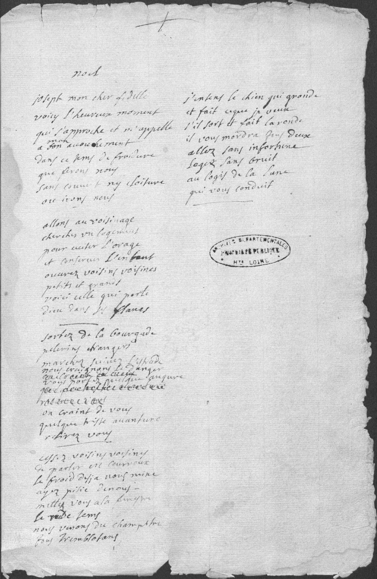 - Dans cette adaptation dont l’auteur n’est sans doute pas le vicaire de Chanteuges car son écriture présente des hampes et jambages nettement plus arrondis, tous les huitains ne sont pas repris. La parturiente, fort démunie et sans domicile fixe si l’on en croit l’expression "loger sans bruis au logis de la lune", n’est autre que la vierge Marie, pourtant sur le point d’enfanter Jésus dans une étable alentours. Dans sa détresse elle en appelle à son bien-aimé Joseph et à la charité de la communauté des Chanteugeoises et Chanteugeois qui pourraient incarner ici le peuple de Bethléem.