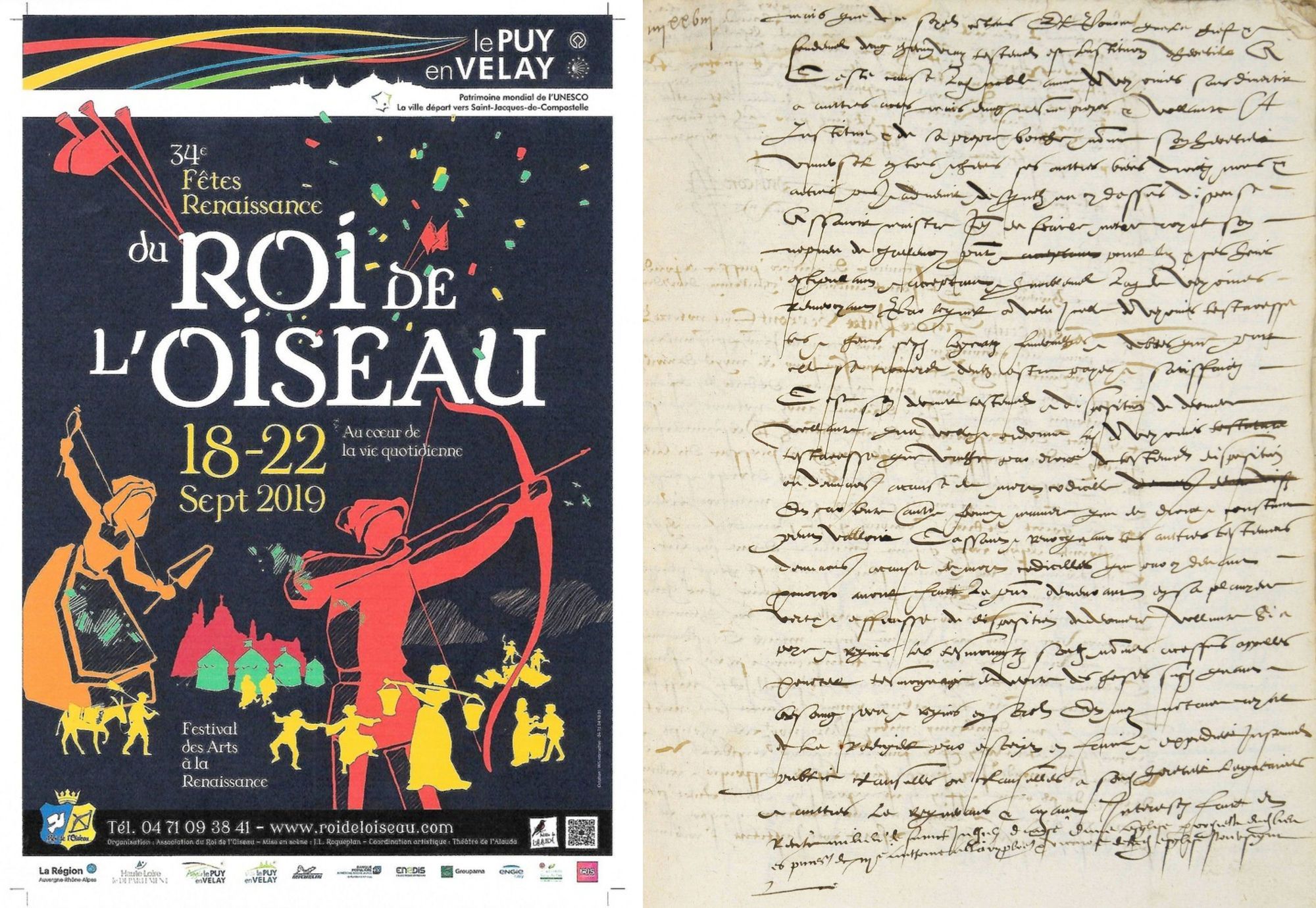 - Les jeudi 19 et vendredi 20 septembre après-midis à la chapelle Anne-Marie Martel en ville haute, Martin de Framond, directeur des Archives départementales de la Haute-Loire et membre de l'association, présentera les expositions créées par l'association. Elles sont consacrées à l’écriture courante durant la Renaissance ainsi qu'aux sous-vêtements et coiffures masculines au début du XVIe siècle. Pour la troisième année consécutive sera notamment présentée l'exposition dédiée aux écritures de la Renaissance en Velay et alentours. En savoir plus sur le site de l'association du Roi de l'oiseau.
