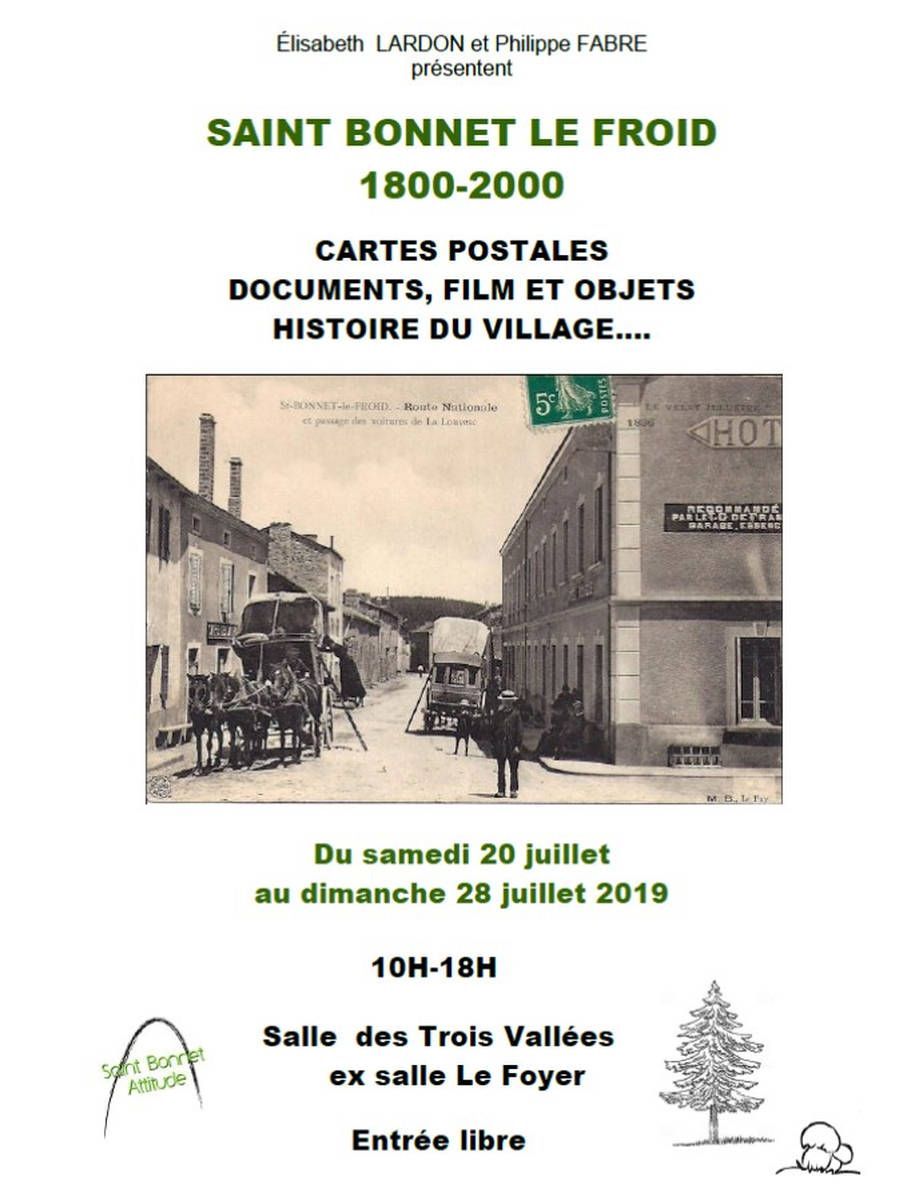 - Élisabeth Lardon et Philippe Fabre présentent l'exposition intitulée Saint-Bonnet-le-Froid, 1800-2000, du lundi 22 juillet au dimanche 28 juillet, de 10H à 18H à la salle des Trois Vallées (ancienne salle "Le Foyer") de Saint-Bonnet-le-Froid.