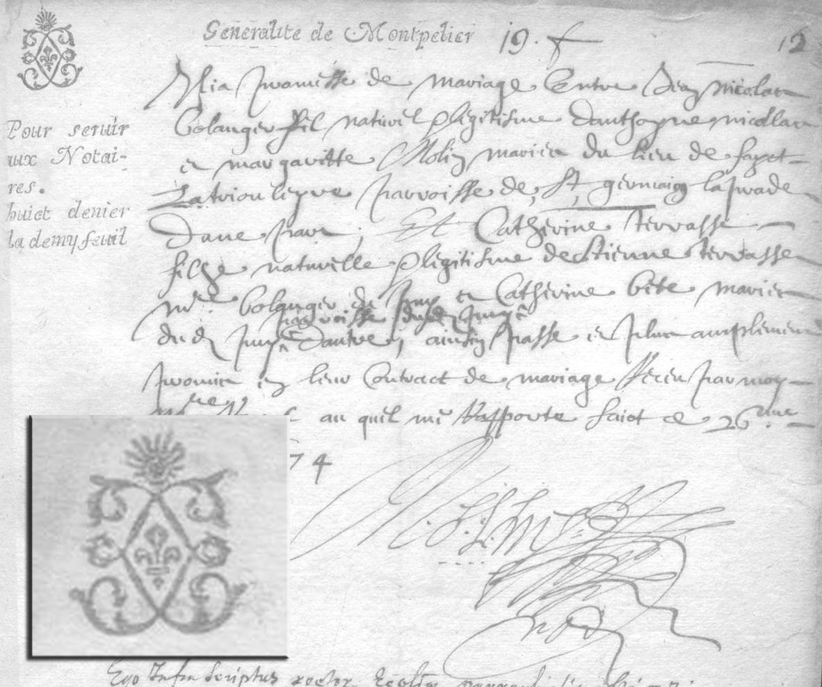 - On remarque en feuilletant les pages de ce registre plusieurs versions de timbres apposés en marge et en tête du papier. Généralement fleurdelisé comme c’est le cas dans cet exemple, il précise le montant de la taxe (« 8 deniers la demie-feuille ») et indique l’émetteur, ici la généralité de Montpellier à laquelle appartenait le diocèse du Puy, qui s’est acquitté de la taxe.