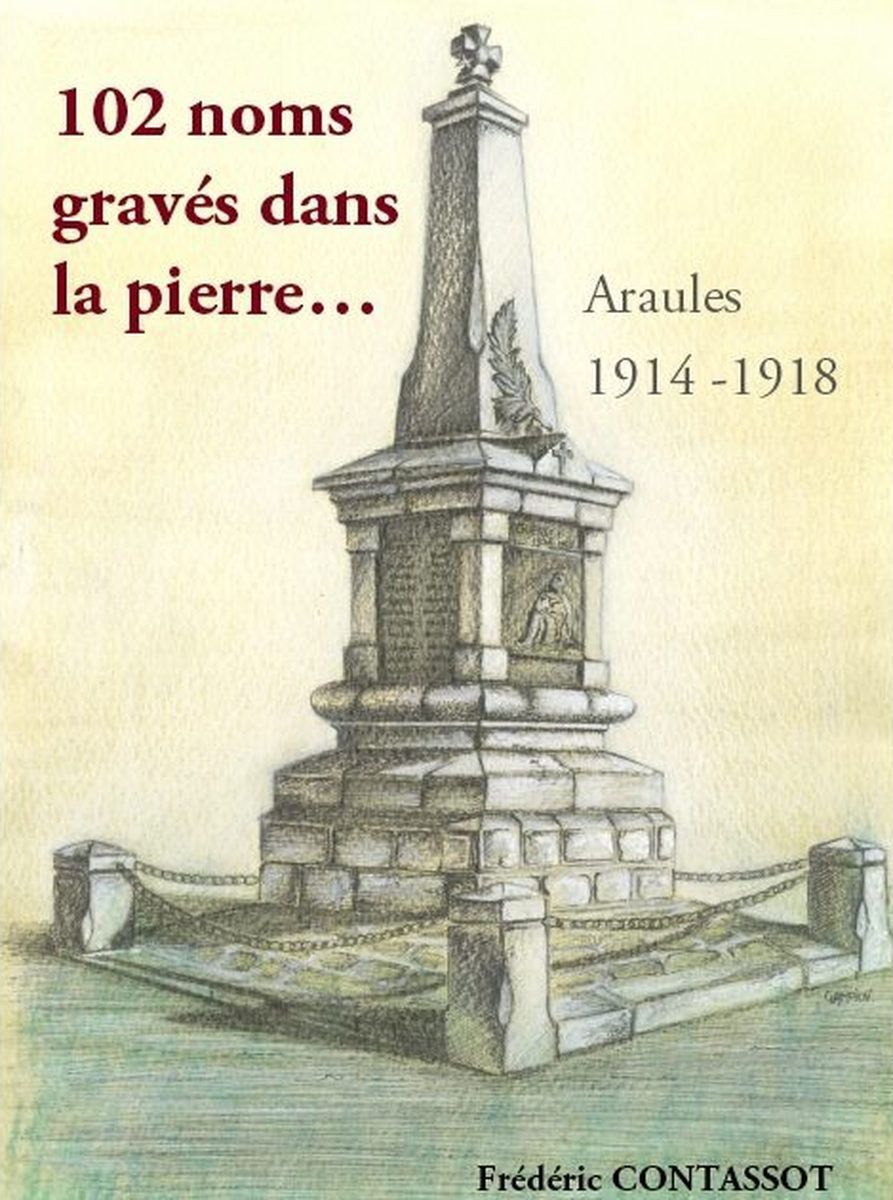 - "102 noms gravés dans la pierre" est le titre de l'ouvrage rédigé par Frédéric Contassot dédié au parcours de vie civile et militaire de ces hommes originaires de la commune d'Araules, morts pour la France durant la Grande guerre. Instituteur jusqu'en 2018 à l'école de l'Auze à Recharinges, l'auteur a effectué ce travail de recherche dans le cadre de la préparation des commémorations du centenaire de la Première Guerre mondiale pour ses élèves, "l’objet de cet ouvrage est de compiler toutes les informations civiles et militaires relatives à ces 102 soldats, afin de mieux cerner ce que pouvait être la vie de ces hommes au destin tragique." (Frédéric Contassot). L'exemplaire remis aux Archives départementales a intégré le catalogue de la bibliothèque sous la cote 4° 13545.