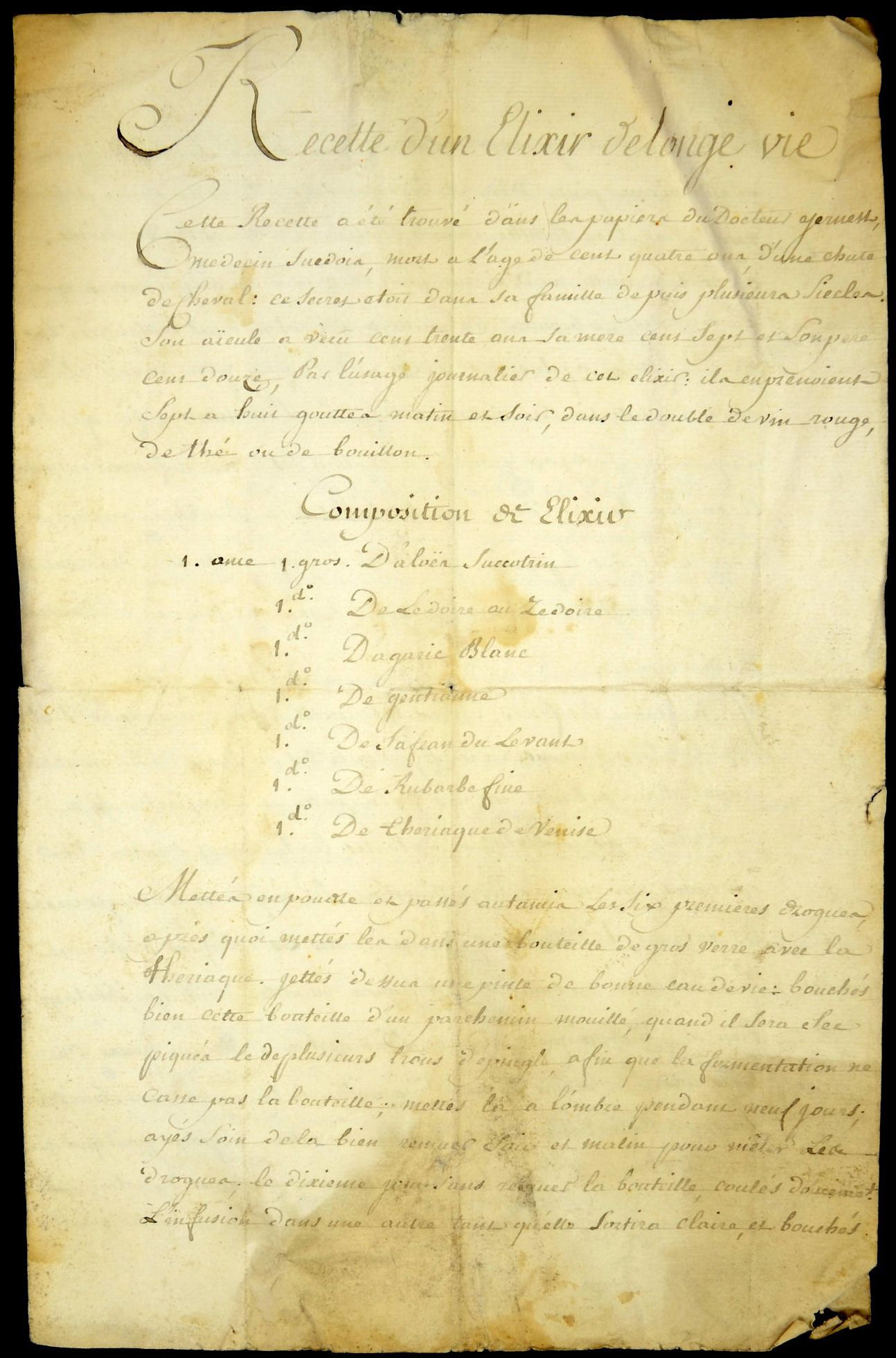 - Le fonds des familles Chaumeils et Frévol de Lacoste contient outre d'importants dossiers concernant directement les familles Frévol de Lacoste et Chaumeils, des pièces originales et parfois inattendues. À titre d'illustration cette Recette d'un élixir de longue vie (consulter dans la visionneuse) tirée de la cote 110 J 187. Trouvée dans les papiers d'un médecin suédois, la recette a été soigneusement recopiée. La lecture du préambule nous apprend que le décès du médecin serait survenu dans sa cent quatrième année à la suite d'une chute de cheval (!), que sa grand-mère serait morte à cent trente ans et que ses parents auraient été tous deux plus que centenaires également.