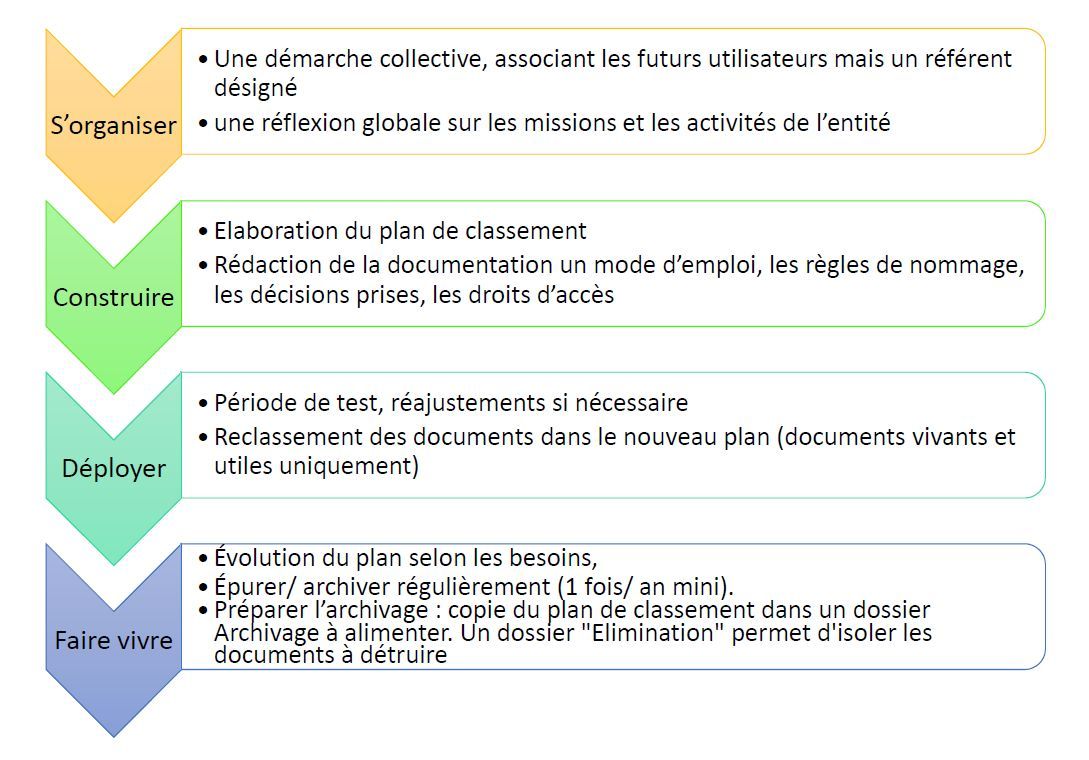 - Cet outil documenté se compose de deux fiches pratiques "Élaborer un plan de classement bureautique" et "Le nommage des documents électroniques", d'une arborescence de répertoires vierges et pré-nommés prêts à l'emploi accompagnée d'un tableur présentant le plan de classement ainsi que son guide d'utilisation.